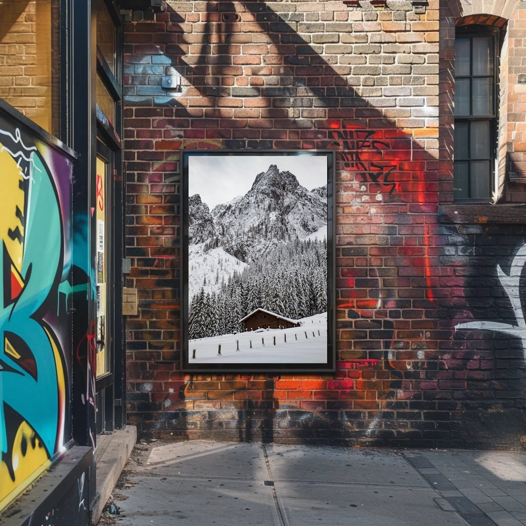 Serene Alpine Cabin in Winter Wonderland National Park Poster presents the tranquil beauty of a snowy alpine retreat. This photorealistic poster captures a rustic wooden cabin snug among snow-laden pines with snow-dusted peaks rising in the backdrop, creating a scene that feels both remote and inviting. Perfect for nature lovers, mountain enthusiasts, and anyone seeking a touch of alpine serenity in their space.