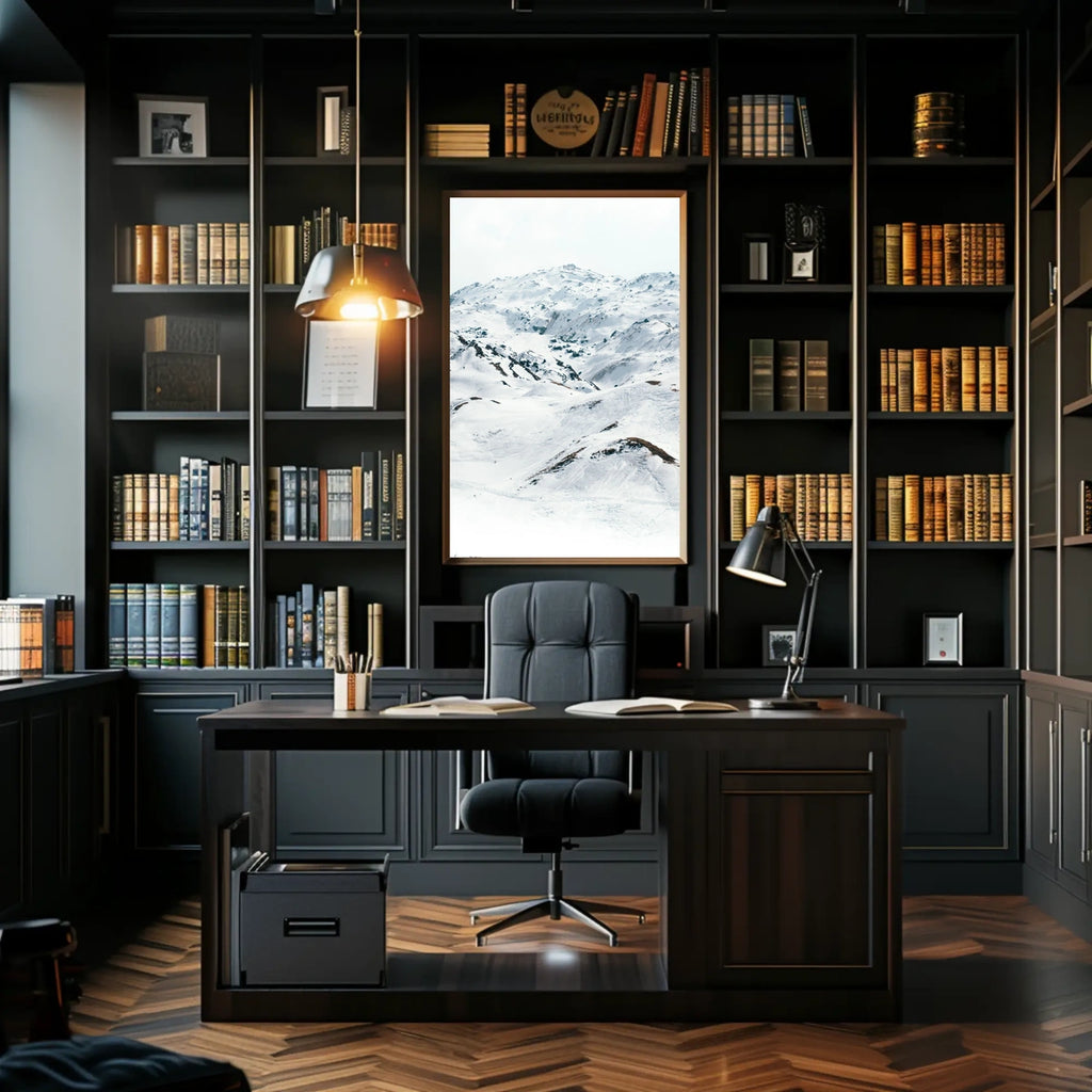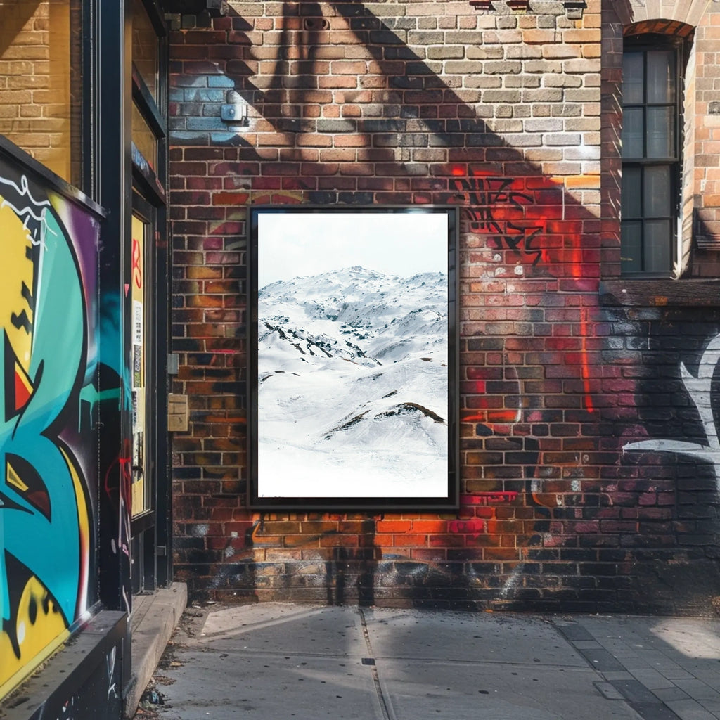 Inspired by alpine landscape scenes, this photorealistic poster showcases majestic wilderness with snow-covered mountains, tranquil rolling hills, and serene peaks. The rocky outcrops provide a rugged contrast to the smooth, snow-dusted slopes, while an overcast sky blends seamlessly with the mountaintops, evoking solitude and natural beauty. Perfect for outdoor enthusiasts and nature lovers alike, this artwork captures the grandeur and magnificence of alpine landscapes.