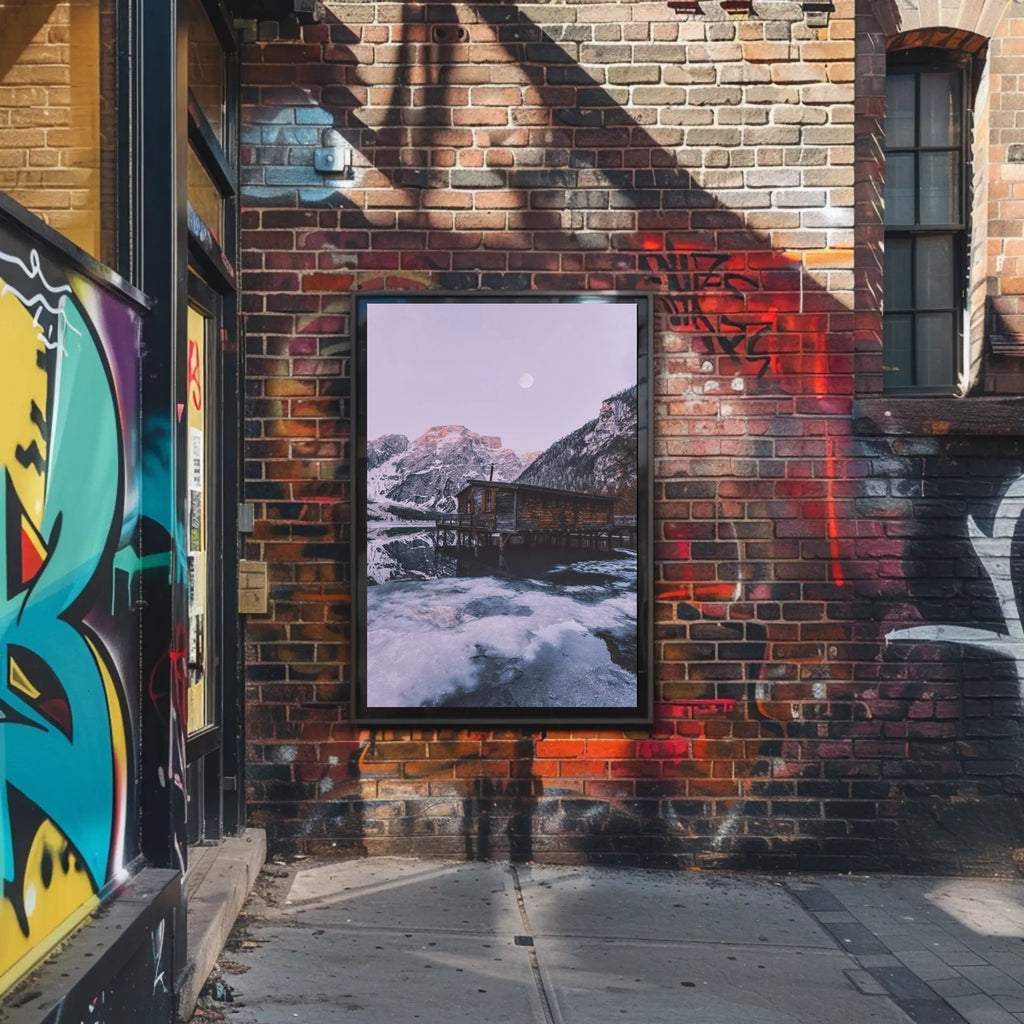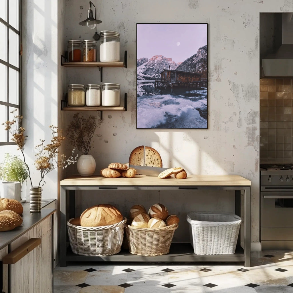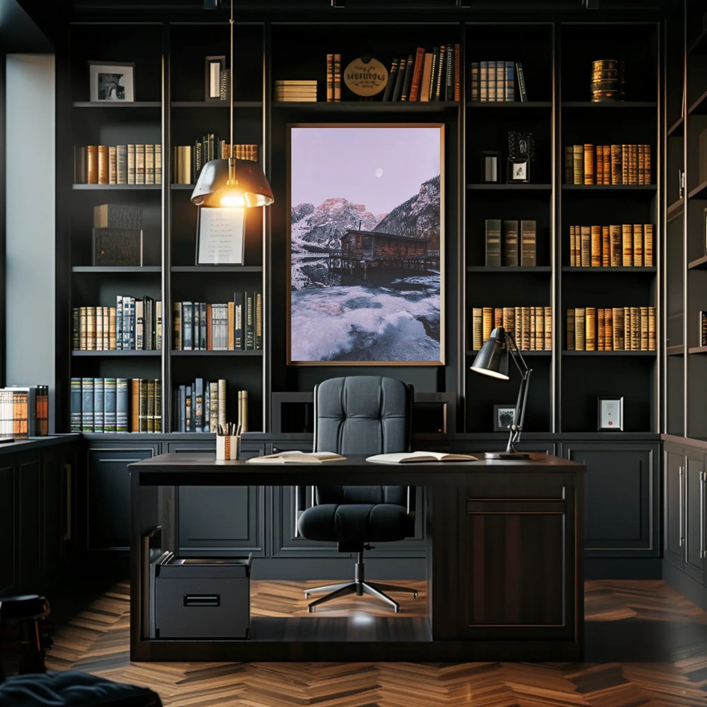 Celebrate the beauty of the Serene Alpine Twilight Escape Landscape National Park Poster with this timeless wall art. This mesmerizing poster captures the peaceful serenity of an alpine landscape at twilight. A wooden cabin perched on stilts rests over a partially frozen lake that mirrors the snow-capped peaks of the surrounding mountains. The soft pastel purple sky and luminous full moon create an ethereal ambiance, suggesting a tranquil escape in a remote European alpine setting. The scene embodies solitude and natural beauty, inviting viewers to immerse in a quiet retreat into nature. Its photorealistic style renders a striking depiction of calm and reflection, perfect for nature enthusiasts seeking tranquility. Perfect for fans of alpine twilight art and cabin lake scenes, this European Alps-inspired poster brings natural beauty into any room.