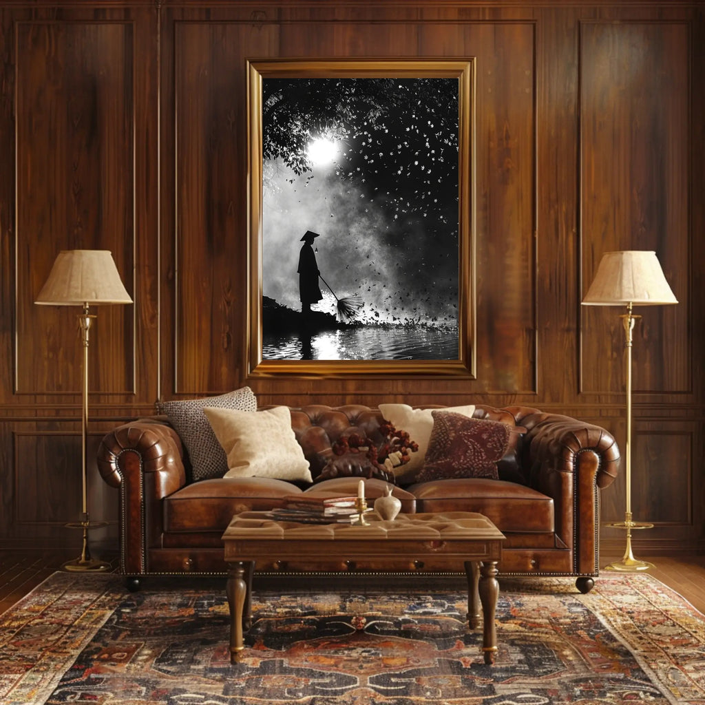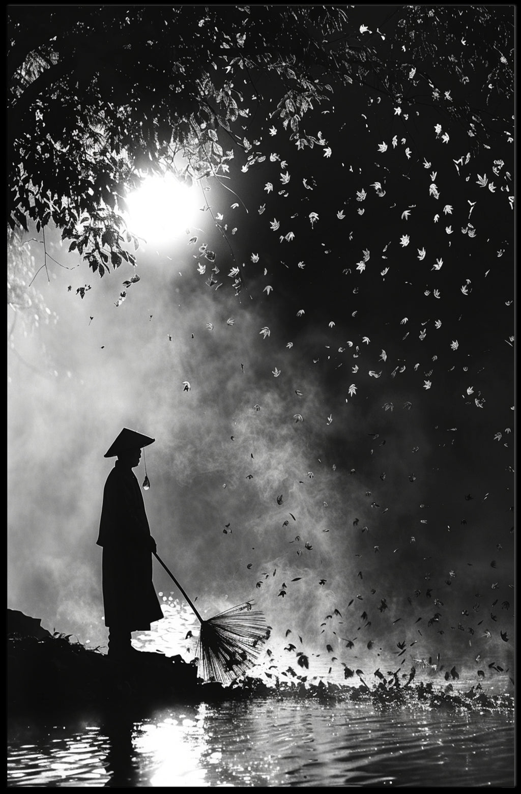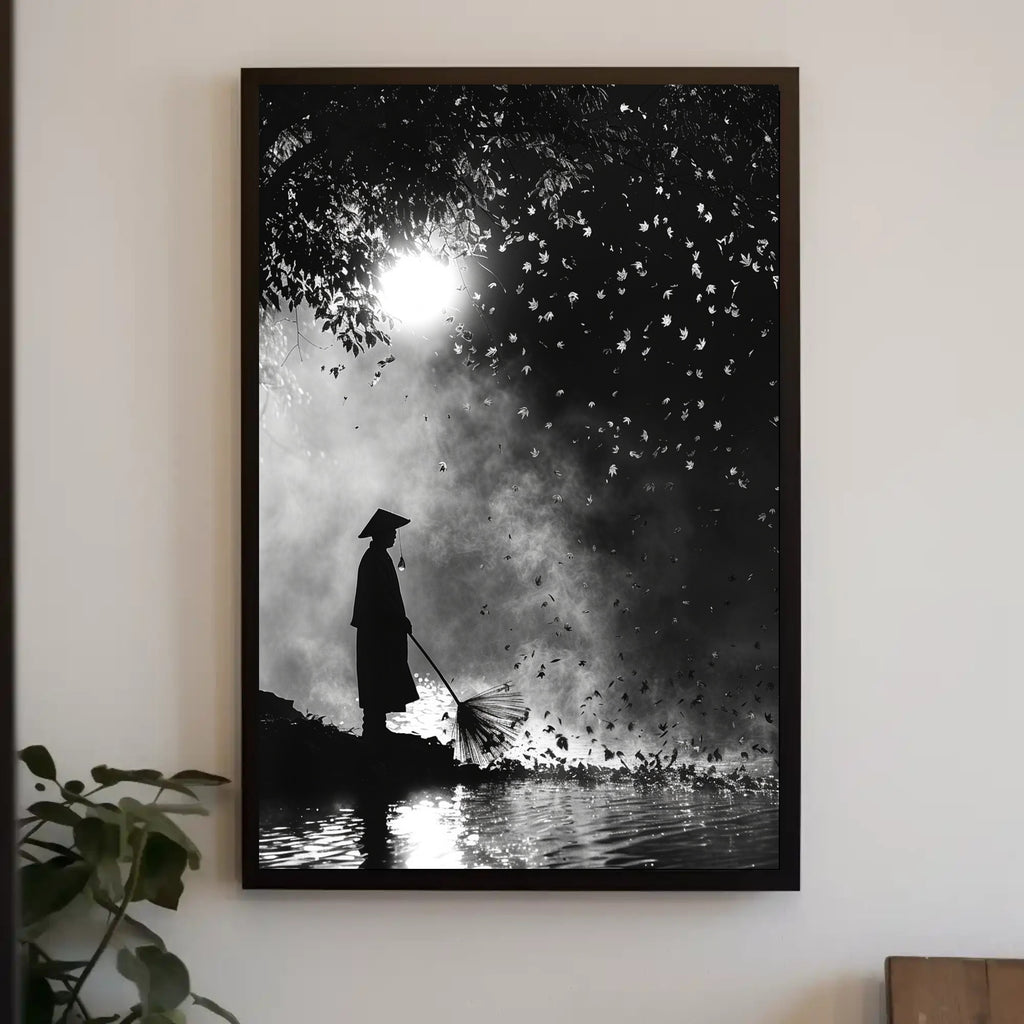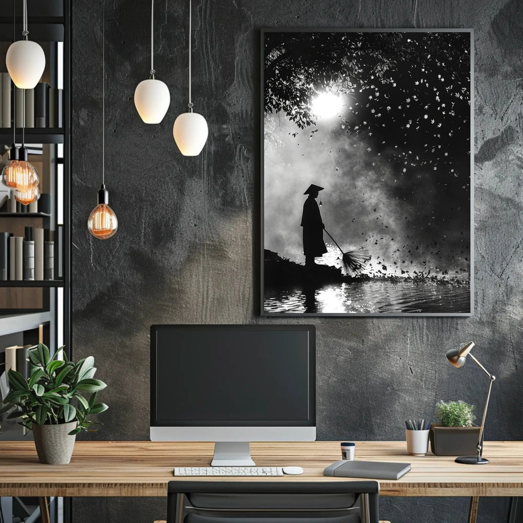 Serene Asian Landscape Art from PosterGoat brings contemplative beauty to your walls with a striking black-and-white poster that captures a lone conical-hat figure standing by water as drifting leaves, mist and a bright sun create a dramatic study in light and shadow.