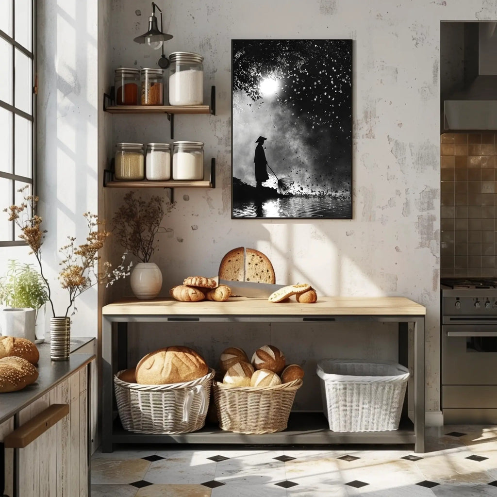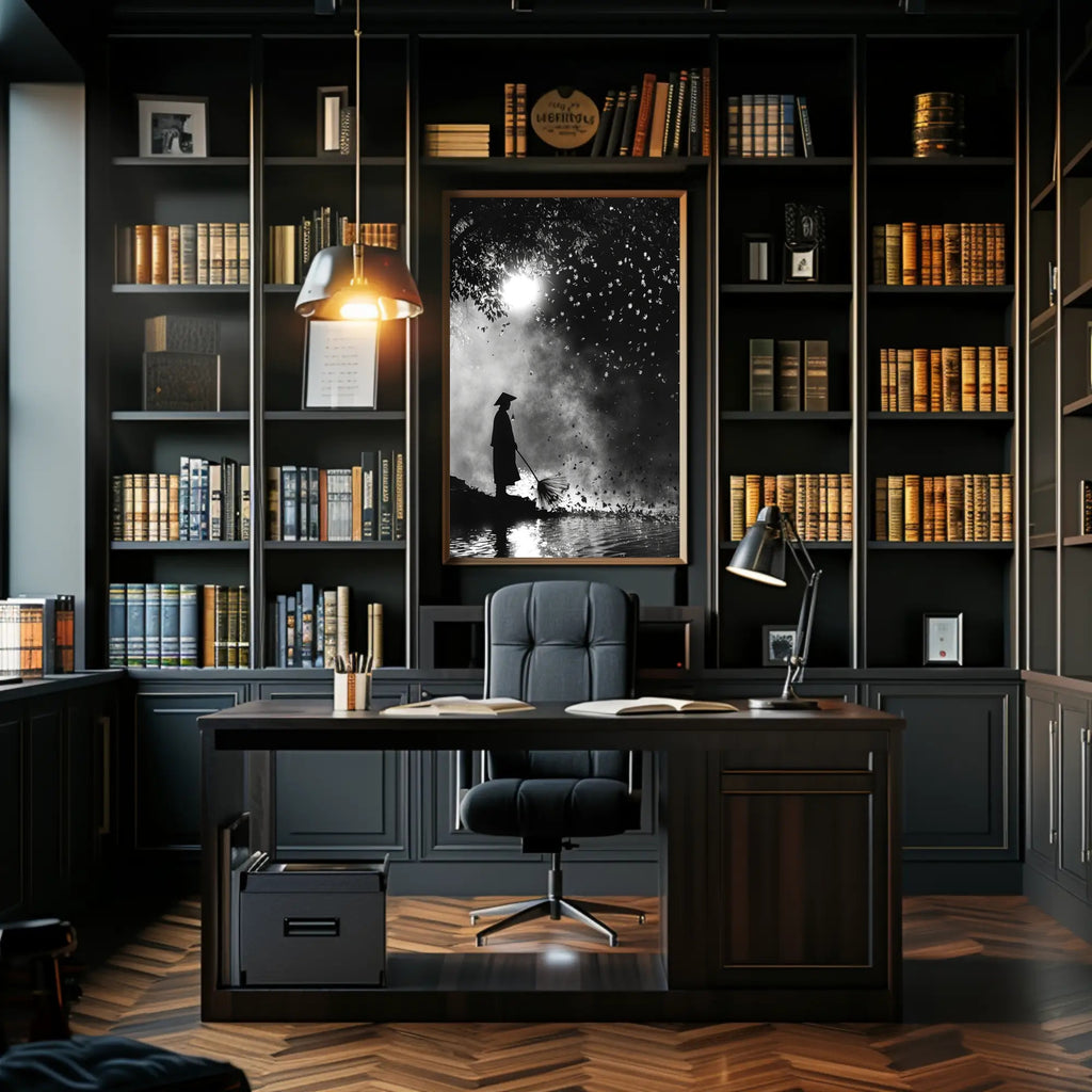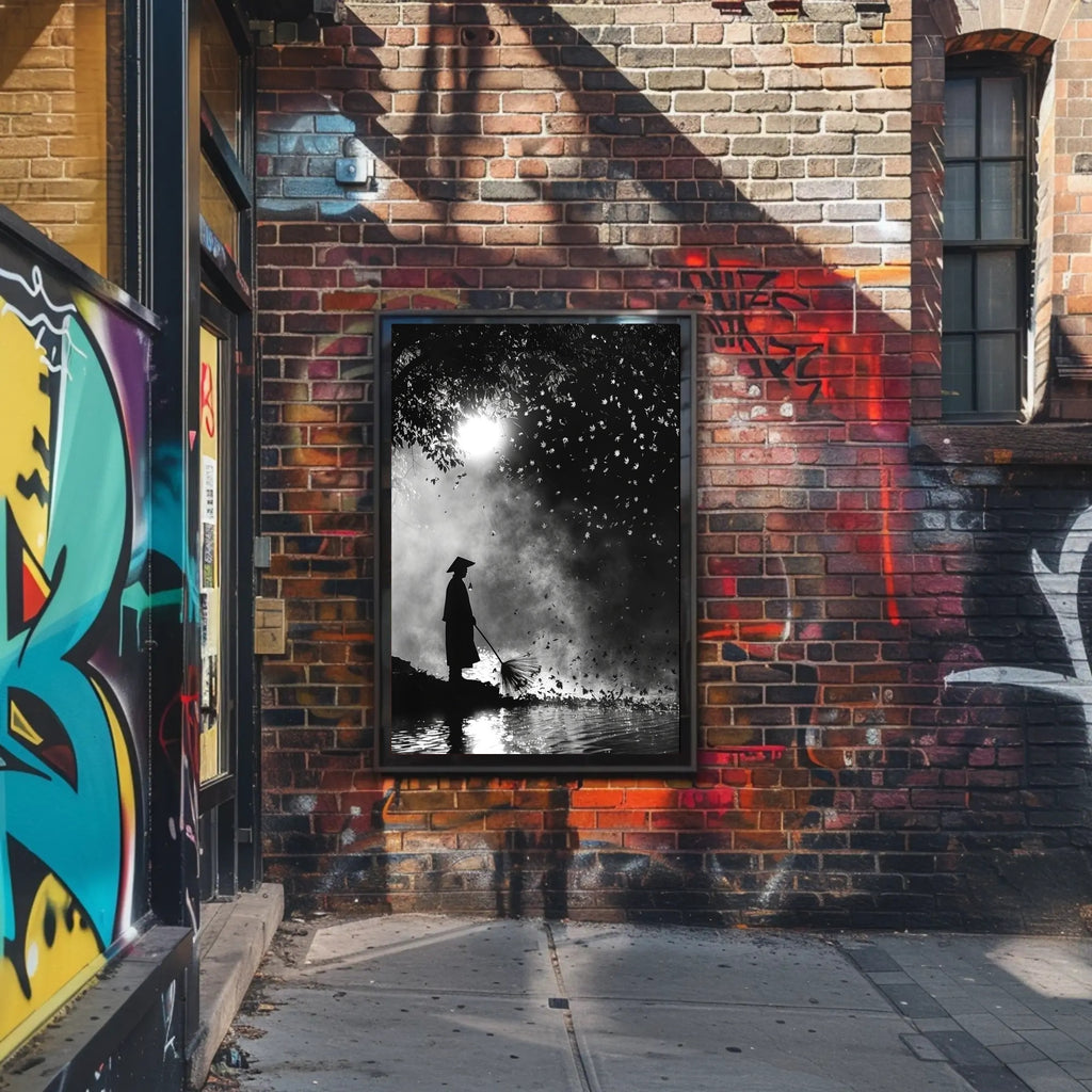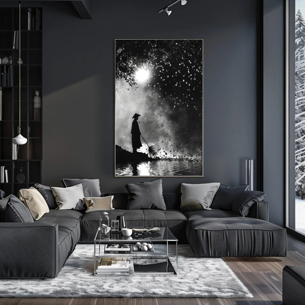 Serene Asian Landscape Art from PosterGoat brings contemplative beauty to your walls with a striking black-and-white poster that captures a lone conical-hat figure standing by water as drifting leaves, mist and a bright sun create a dramatic study in light and shadow.