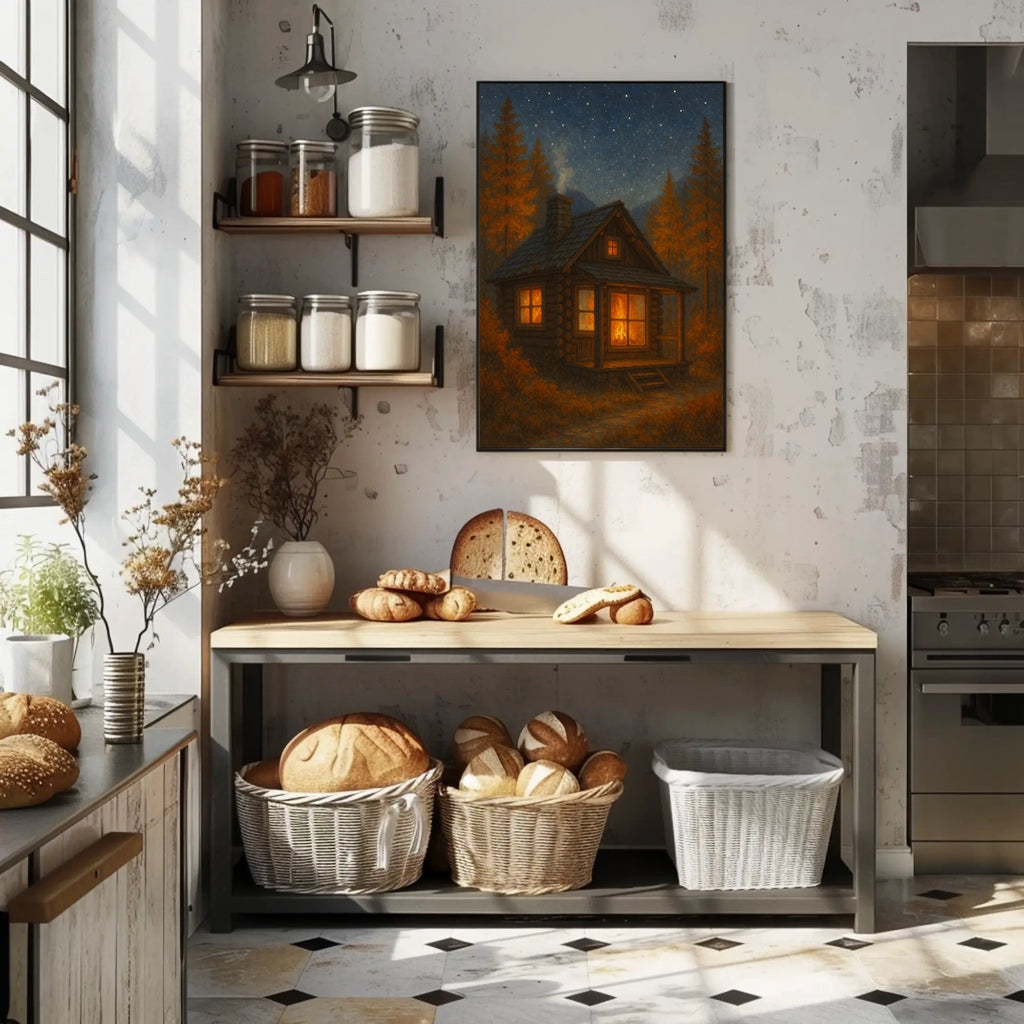 Experience the tranquility of a serene autumn night: a cozy log cabin nestled within a forest, bathed in the warm hues of orange and brown autumn foliage. The cabin's glowing windows suggest inviting warmth, whether from a crackling fire or soft interior lighting, creating a comforting contrast to a dark, starry sky above. This painterly texture art evokes nostalgia and peace, making it an ideal addition to any home seeking to capture warmth, nature, and the intimate beauty of a tranquil night. It is a perfect fit for autumn night poster collections, cozy cabin print displays, and nostalgic wall decor that resonates year after year.