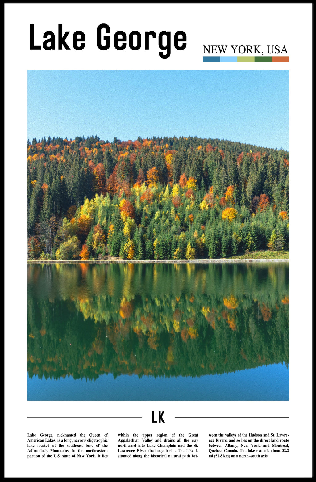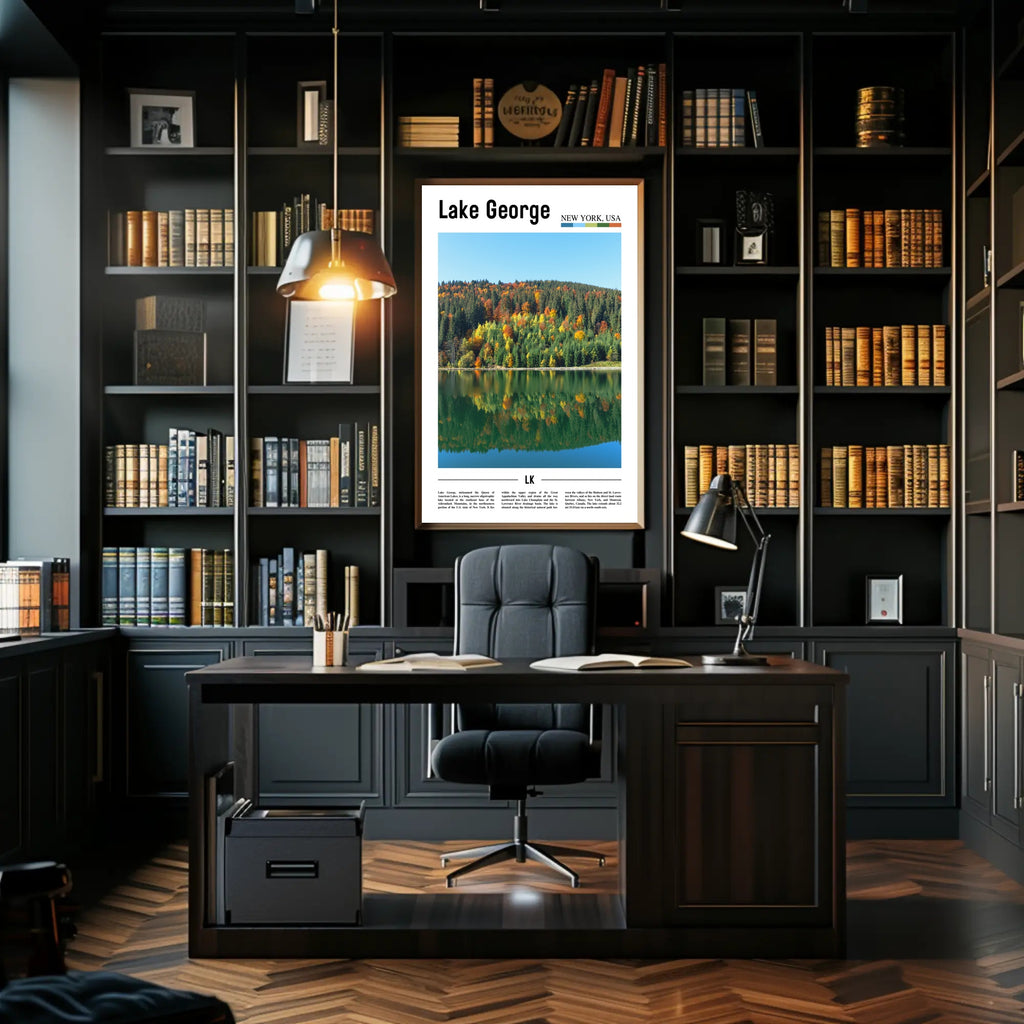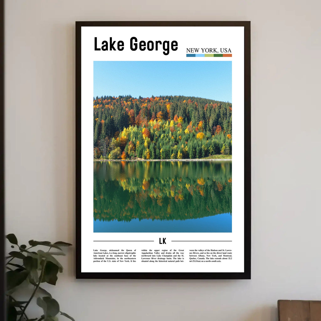The artwork showcases the scenic view of Lake George during autumn, where the golden leaves create a stunning contrast against the serene blue waters. This nature art not only beautifies your space but also serves as a daily reminder of the peaceful moments spent in nature. According to recent studies, displaying calming art in interiors can reduce stress levels by up to 60%, making this travel poster a perfect addition for those seeking a sanctuary in their living space.