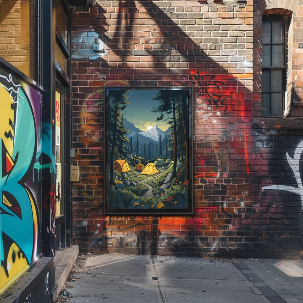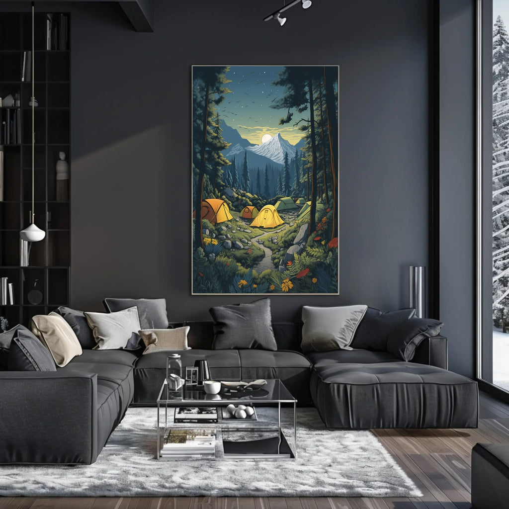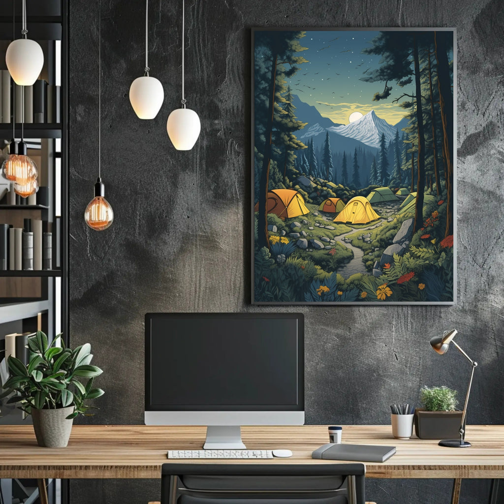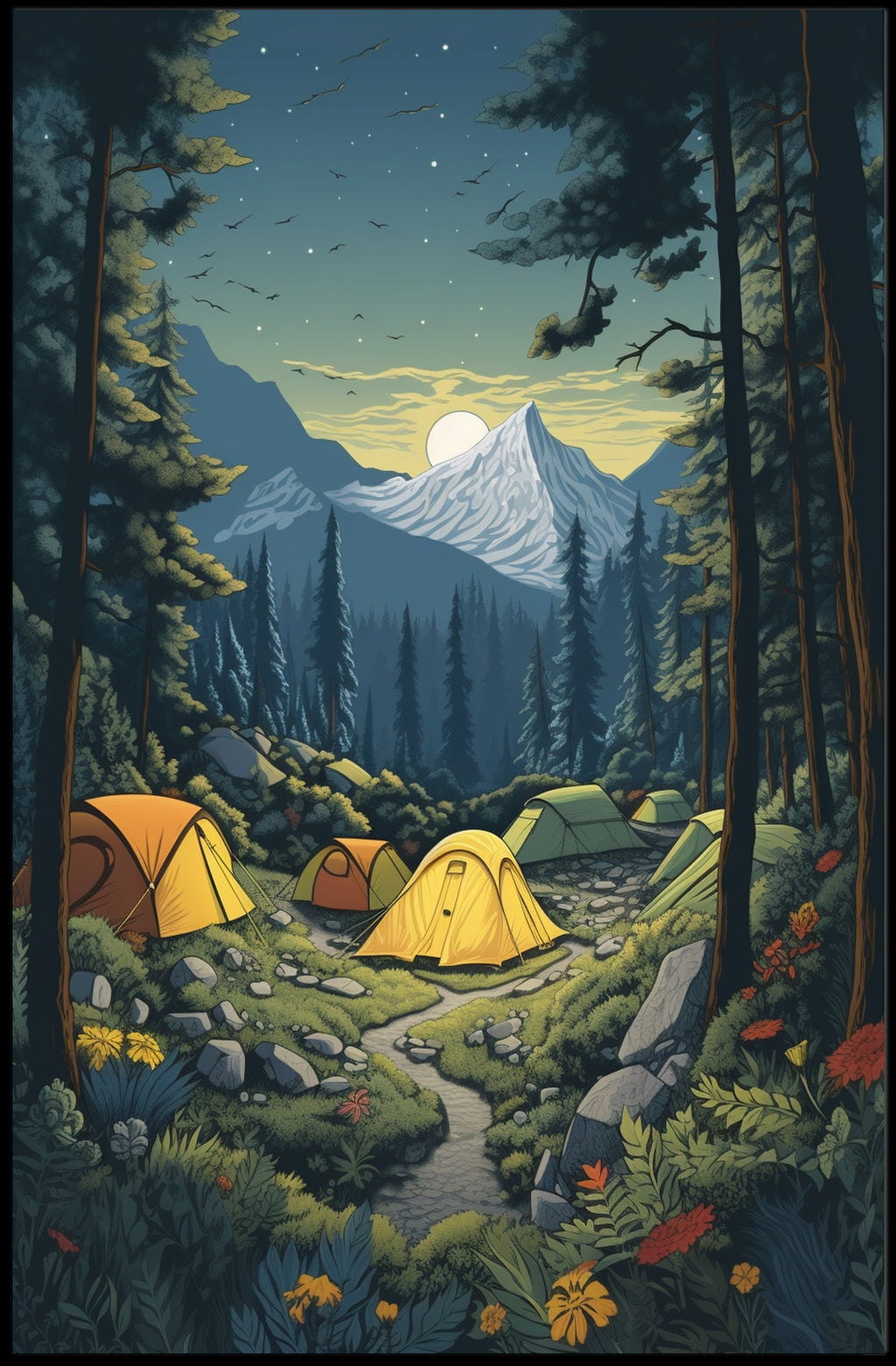 Immerse yourself in nature with this beautiful poster showcasing a serene camping scene in a lush forest with majestic mountains in the background. Experience the tranquility of contemporary outdoor life, with vibrant tents in striking hues such as yellow and green set against a nighttime sky, complete with a brilliant moon. Perfect for nature lovers, this artwork captures the peaceful essence of camping and evokes a sense of adventure and exploration. Ideal for home décor, office spaces, or gifts, it embodies the untouched beauty and allure of the great outdoors.