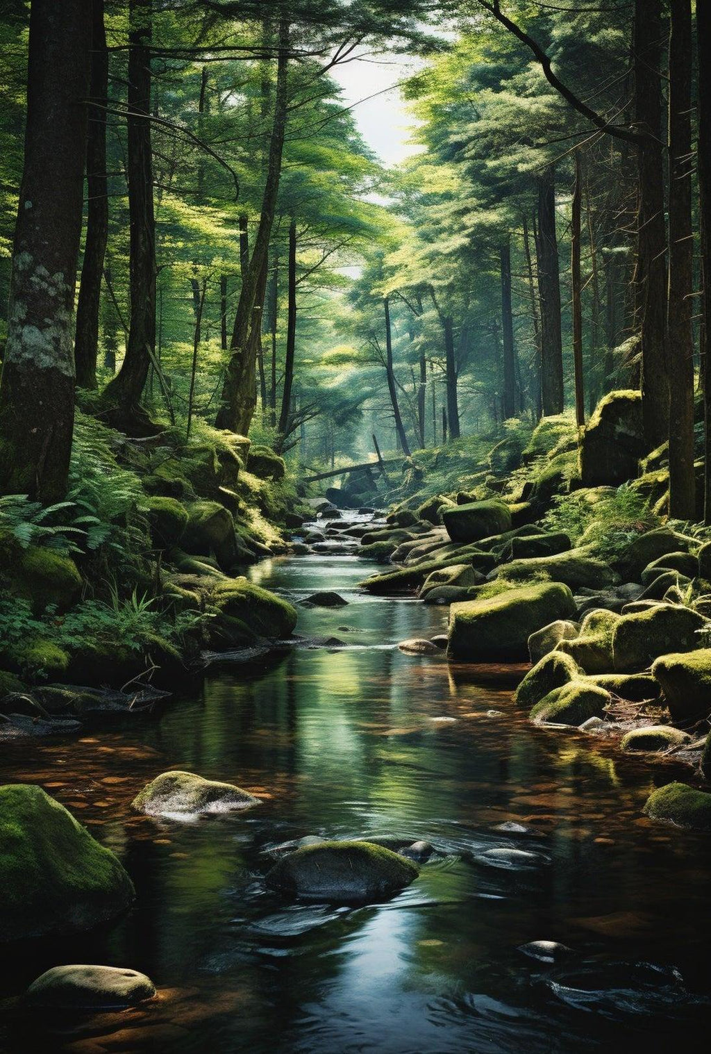 Serene Forest Scene — Nature's Tranquility National Park Poster by PosterGoat brings a photorealistic stretch of temperate forest into your home, capturing a moss‑lined stream, sunlit canopy, and the mirror‑like reflections that create a calming, immersive focal point for any room.