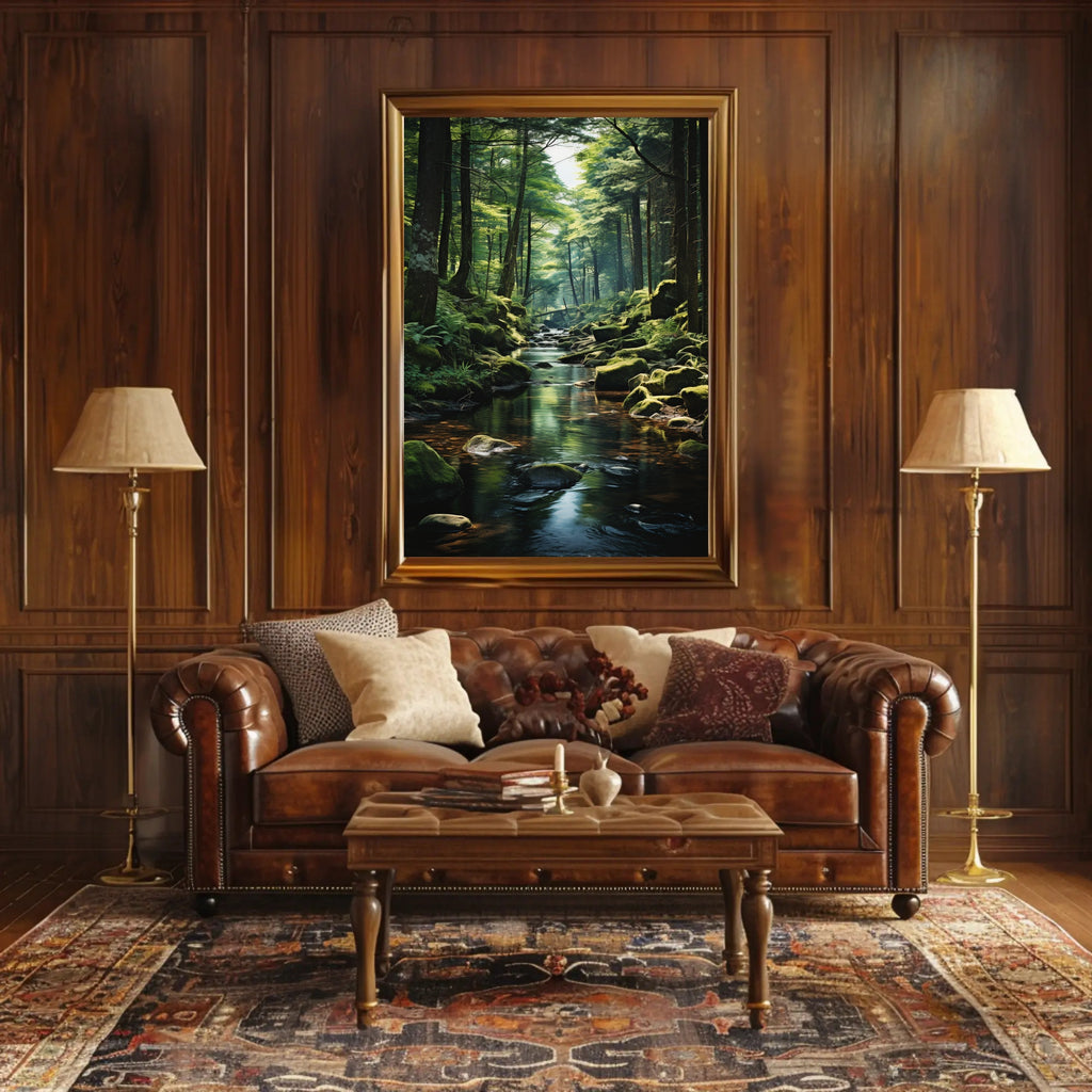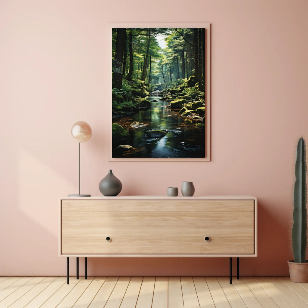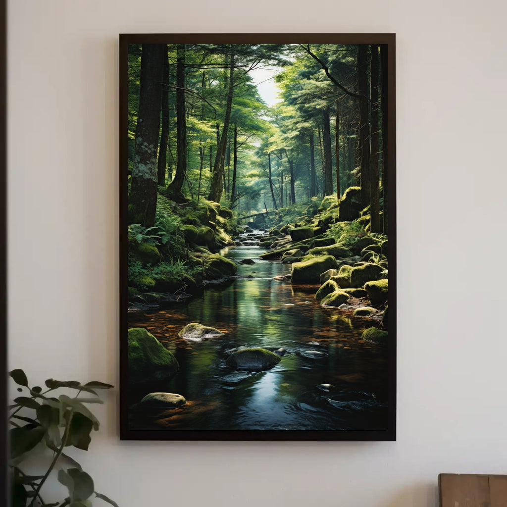 This high‑resolution poster shows lush greenery, textured tree trunks, and smooth river stones bathed in dappled light—perfect for creating a tranquil ambiance in living rooms, bedrooms, offices, or meditation corners. The realistic artistry draws the eye down the winding stream, inviting viewers to pause and breathe.
