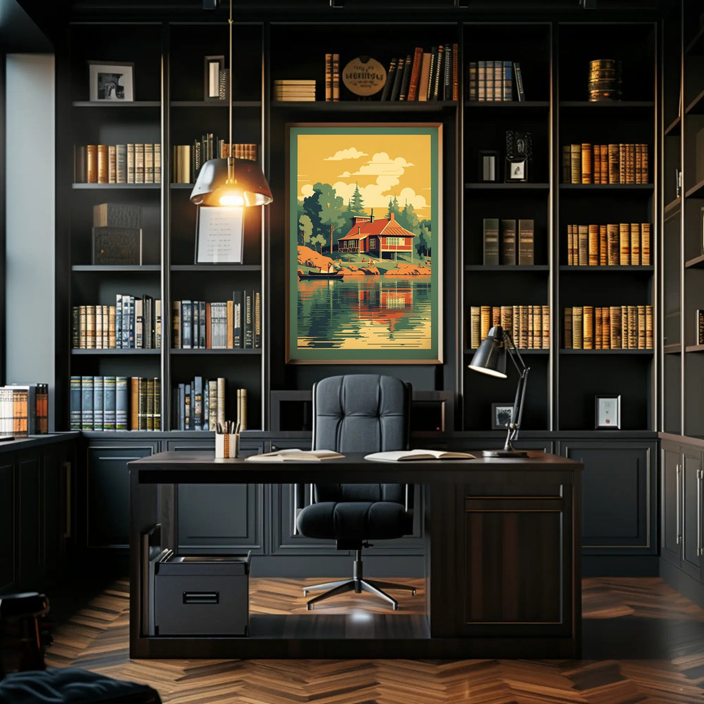 This poster features a cozy lakeside cottage set against a lush forest backdrop, bold outlines and simplified shapes, and a warm, reflective palette that mirrors the cabin on still water. The minimalist, line-art styling and vintage travel poster composition make it a perfect statement piece for living rooms, cabins, offices, or gallery walls.