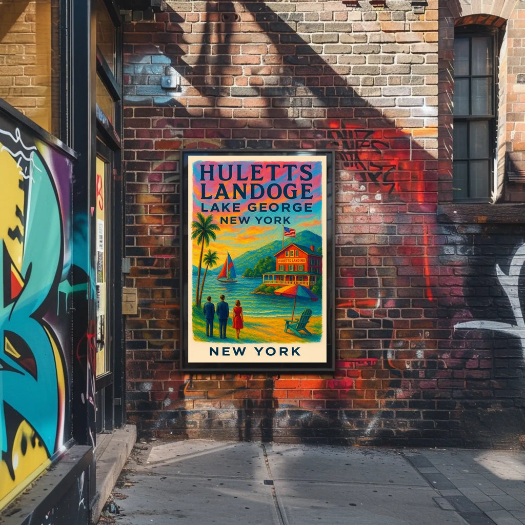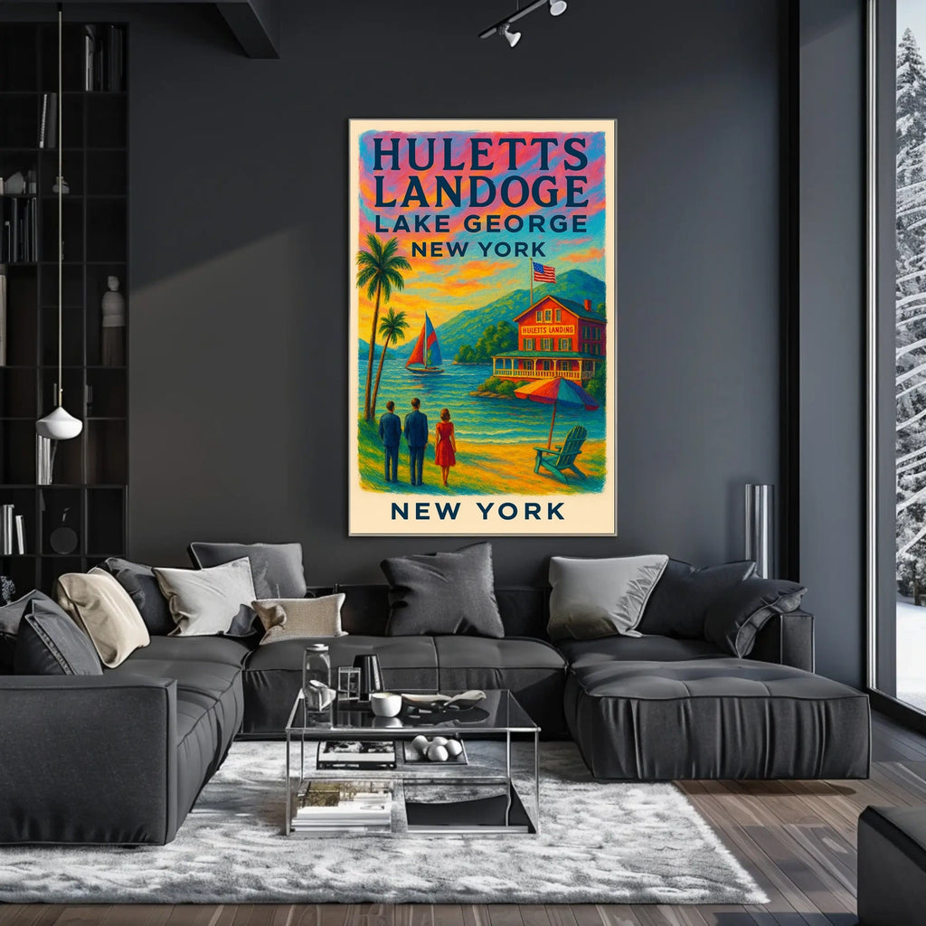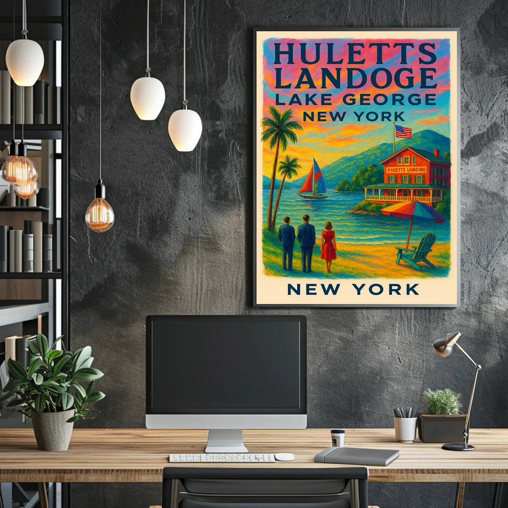 Intro: Experience the tranquility of a vintage-inspired lakeside scene at Huletts Landing, Lake George, New York. This poster captures a peaceful evening as two men and a woman admire a vibrant sunset and a color-sailed sailboat gliding across the lake, inviting you to unwind and dream.