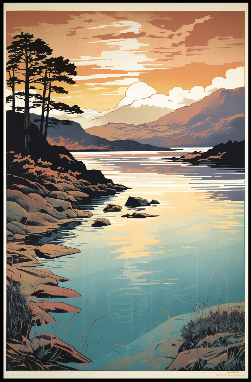 Bring the quiet grandeur of the outdoors into your home with the Serene Lakeside Sunset National Park Poster from PosterGoat. This evocative landscape poster captures a still, reflective lake edged by rocky shores and silhouetted pine trees beneath a warm, vintage-style sky of orange, pink, and blue—an ideal piece of nature art for creating a calming focal point in any room.