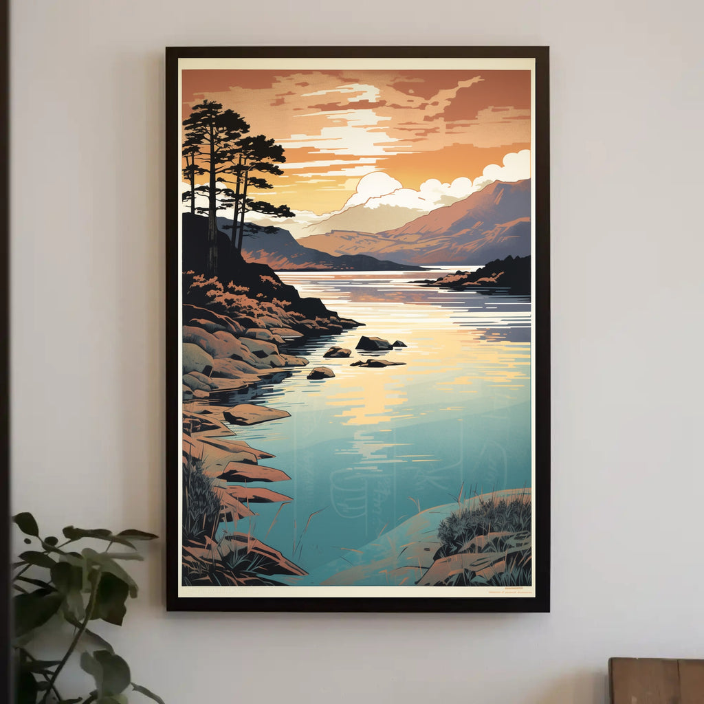Bring this scenic view home today. Add the Serene Lakeside Sunset National Park Poster to your cart and transform your wall into a window on nature.