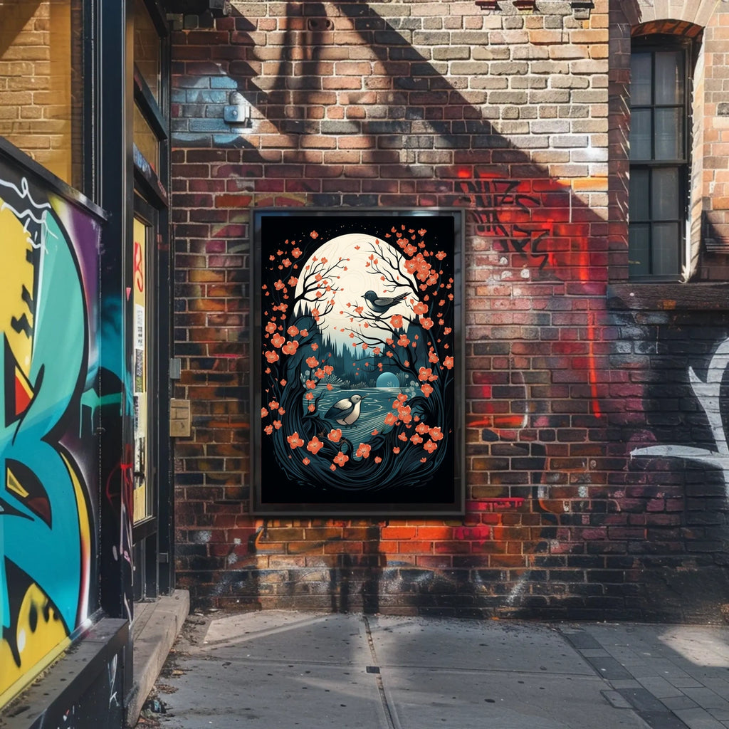 Serene Moonlit Birds Nature Art Poster transforms your space into a tranquil retreat. This nature poster captures a serene scene: two birds gracefully perched on intricate branches amidst vibrant red-orange blooms. The luminous full moon casts a tranquil glow over the reflective water, silhouettes of surrounding trees and distant mountains creating a mystical ambiance. Blending modern illustration with traditional art, the piece uses clean lines and soft color gradients to evoke a sense of peace and natural beauty. Perfect for nature lovers and anyone seeking a calming, dreamlike atmosphere, this artwork adds a touch of serenity to any room. It’s a standout among bird art, full moon artwork, and moonlit scenes for enchanting nature lovers and those who appreciate peaceful wall art.