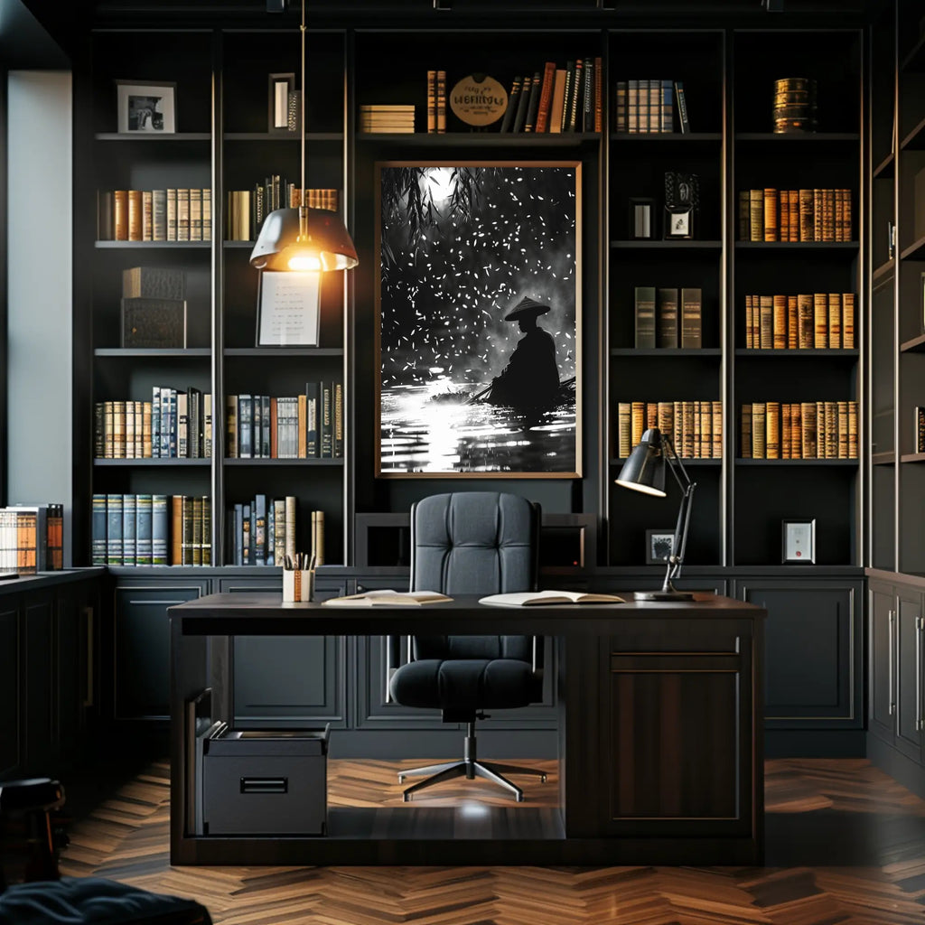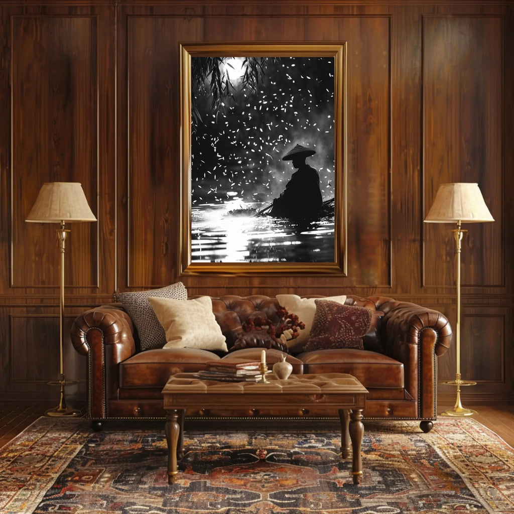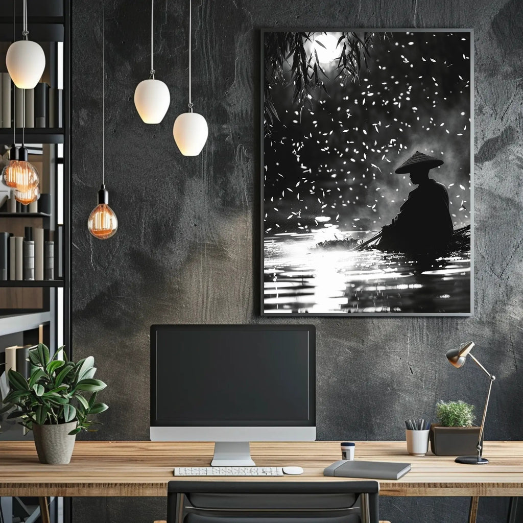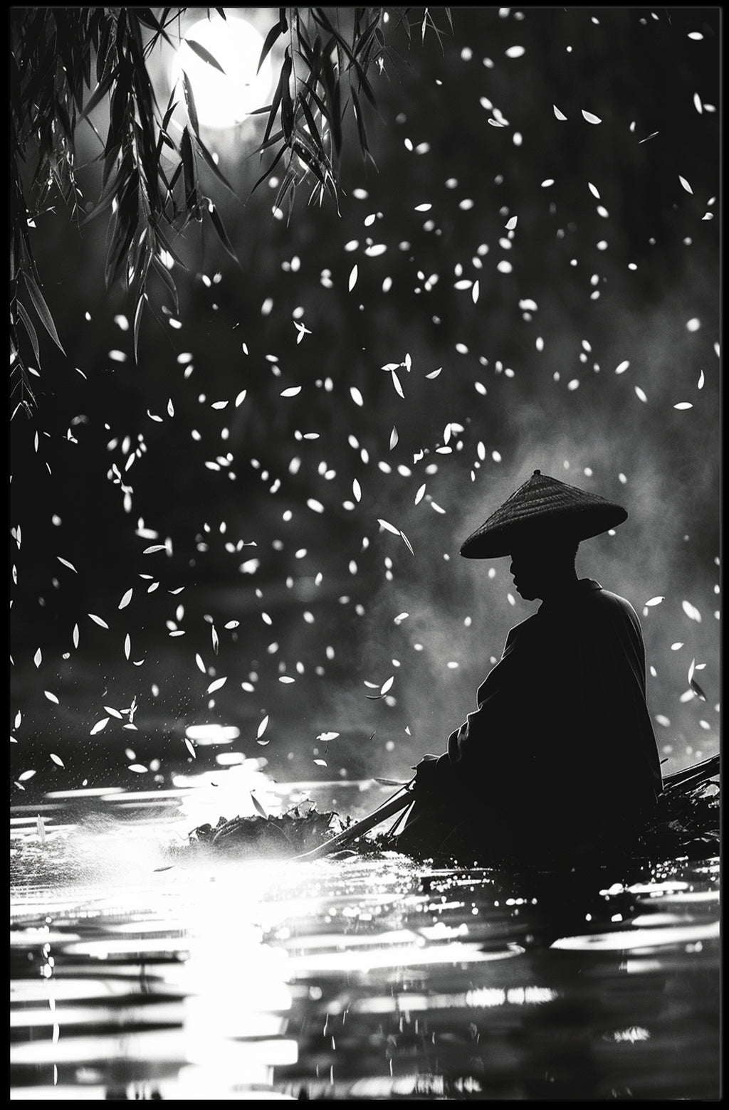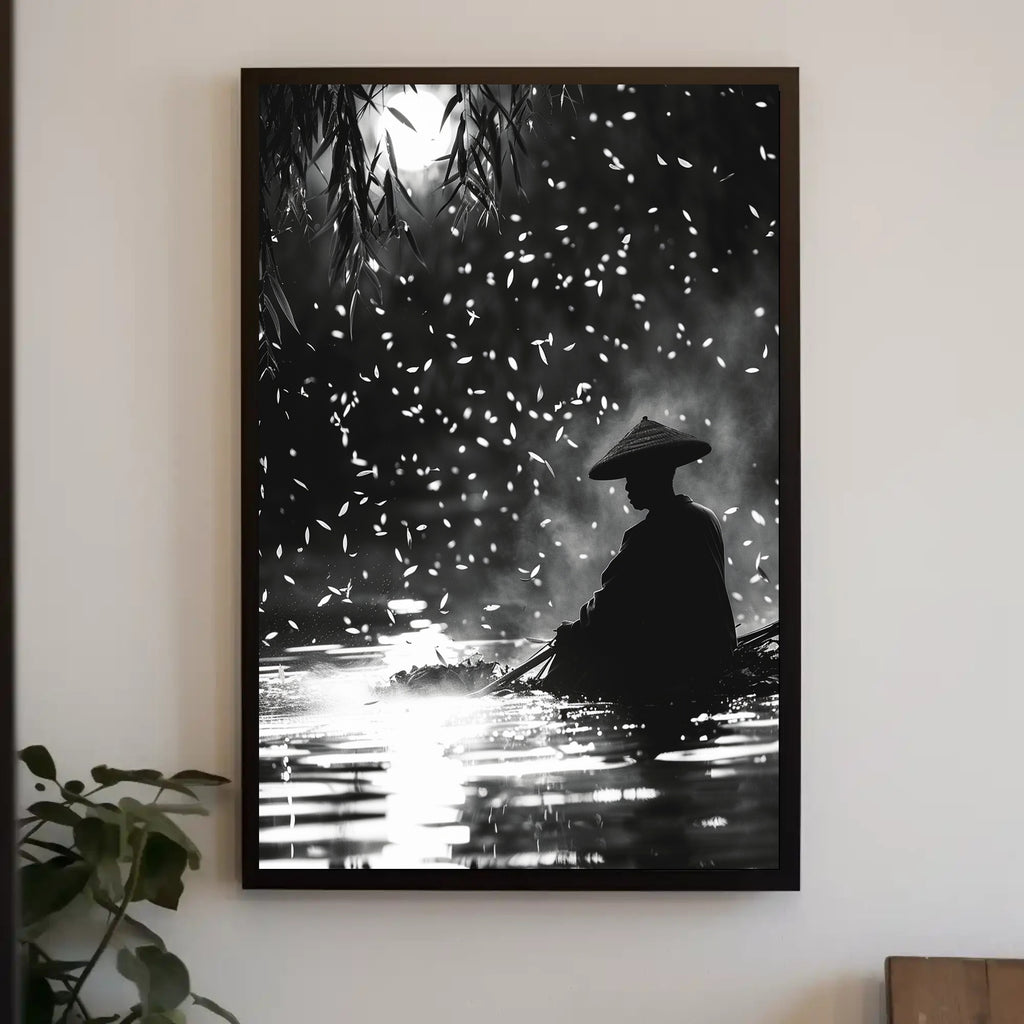 Serene Moonlit Water Journey — an evocative monochrome poster from PosterGoat that brings quiet reflection and Asian-inspired artistry to your walls. This minimalist, vintage-style print captures a lone figure in a conical hat rowing beneath a full moon as delicate petals drift across luminous, reflective water.