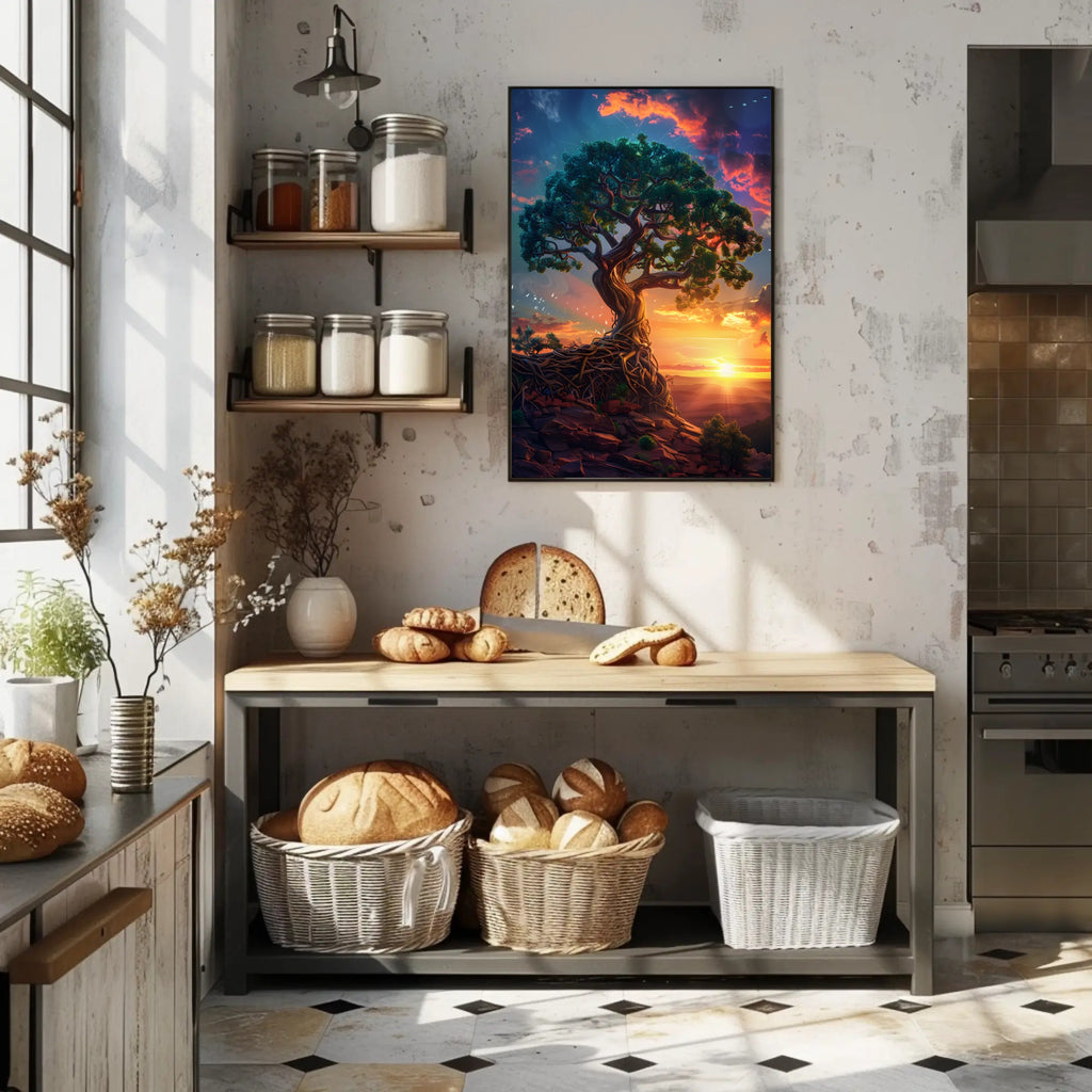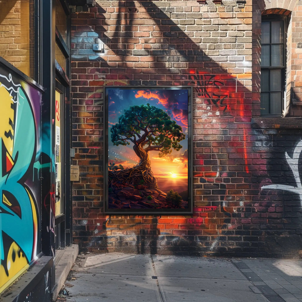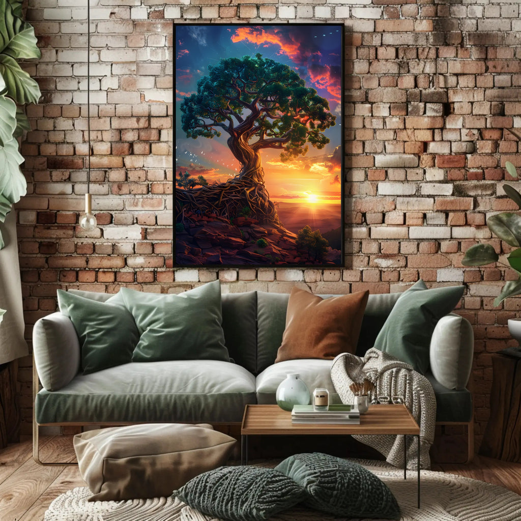 Bring the quiet majesty of the forest into your living space with the Serene Pathway Through Forest Glade Artistry National Park Poster by PosterGoat. This photorealistic poster captures a single, sculptural tree set against a radiant sunrise—twisting roots, richly textured bark and a canopy that filters golden sunlight into the valley below. Perfect for nature lovers and anyone seeking a calming focal point for home or office decor.
