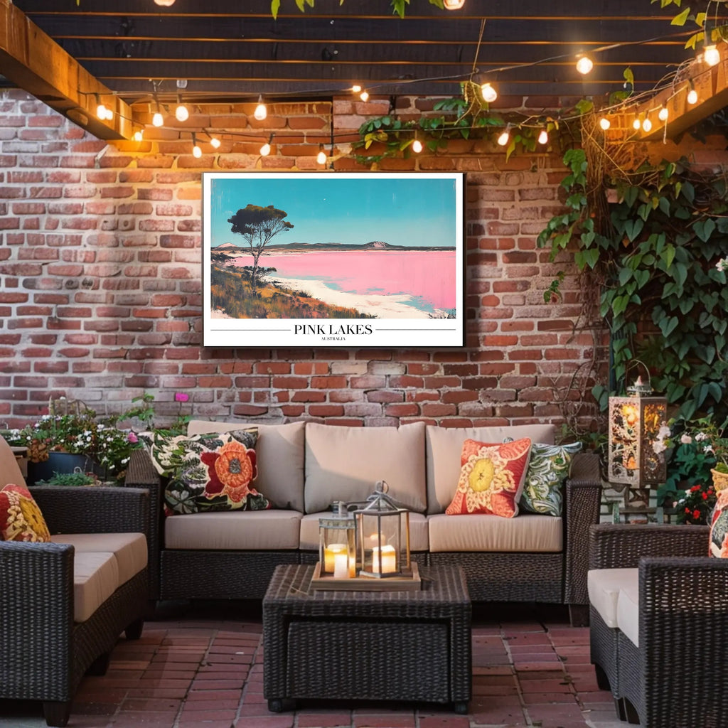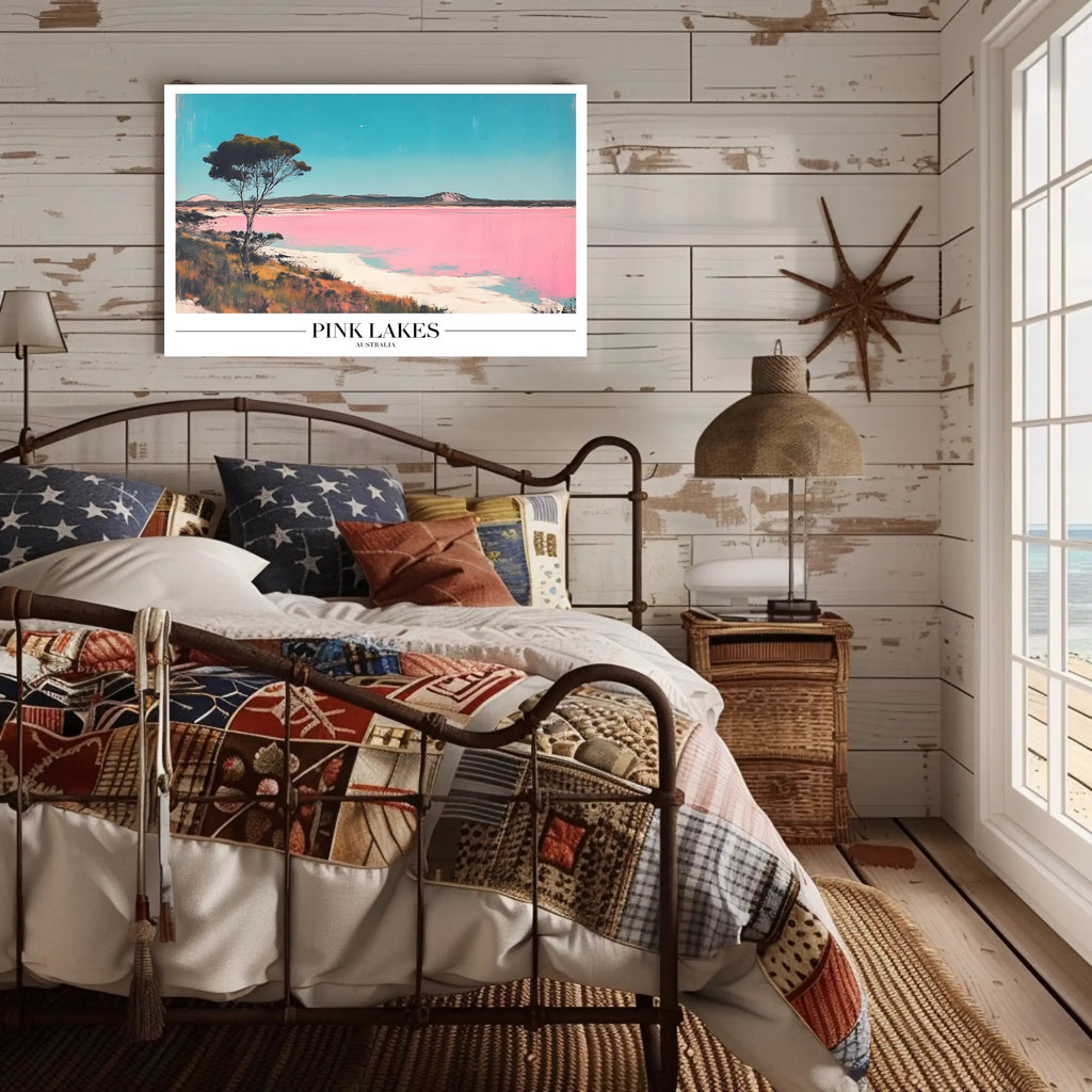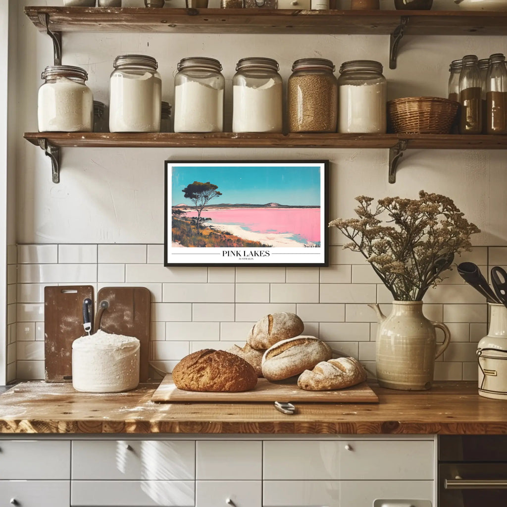 Perfectly suited for Home & Garden decor, this print pairs beautifully with Mid-Century Modern and Pop Art interiors. The clean white border and elegant "PINK LAKES — AUSTRALIA" type give the piece a classic travel-poster look that anchors a gallery wall or becomes a striking focal point above a sofa, desk, or kitchen coffee bar.