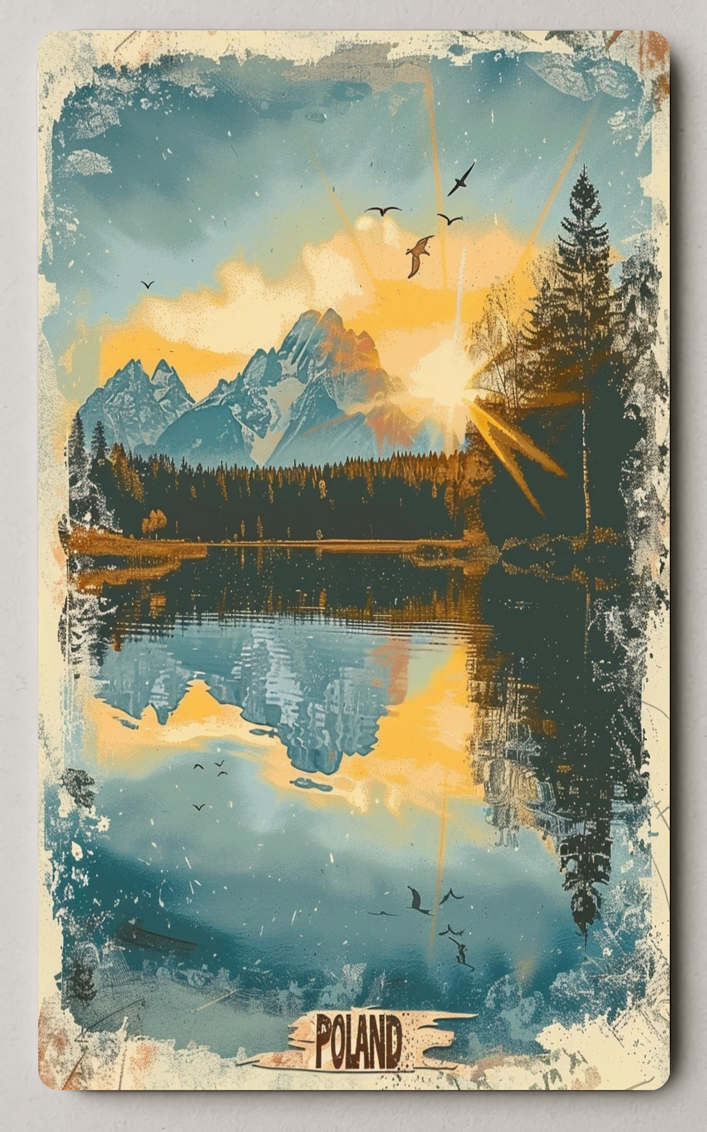 Capture a moment of calm with the Serene Polish Landscape Vintage Art Trading Card from PosterGoat — a collectible card that blends vintage pop-art charm with breathtaking Polish scenery. This high-quality print celebrates mountains, mirrored lakes, sunlit skies and whispering pines rendered in a worn, nostalgic style perfect for art collectors and lovers of scenic nature artwork.