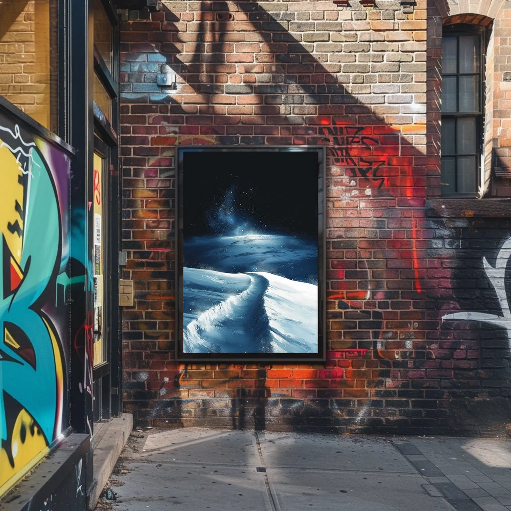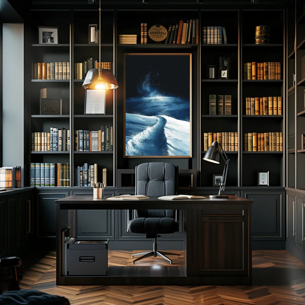 This modern, slightly surreal illustration features a photorealistic touch, highlighting the intricate textures of the snow and the shimmering stars above. The cool blues and whites evoke solitude and calm, inviting introspection and contemplation in any space.