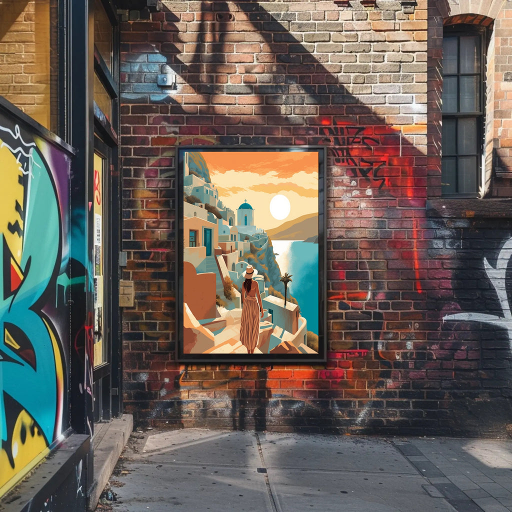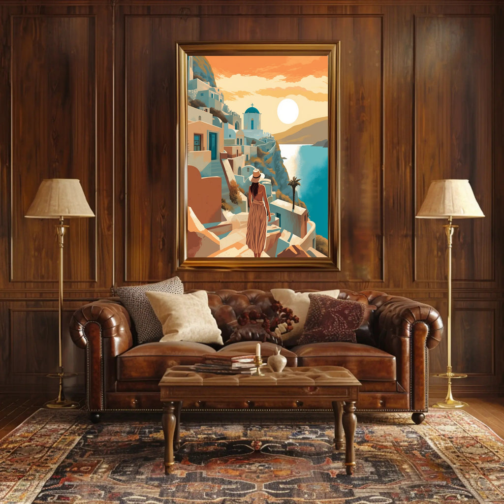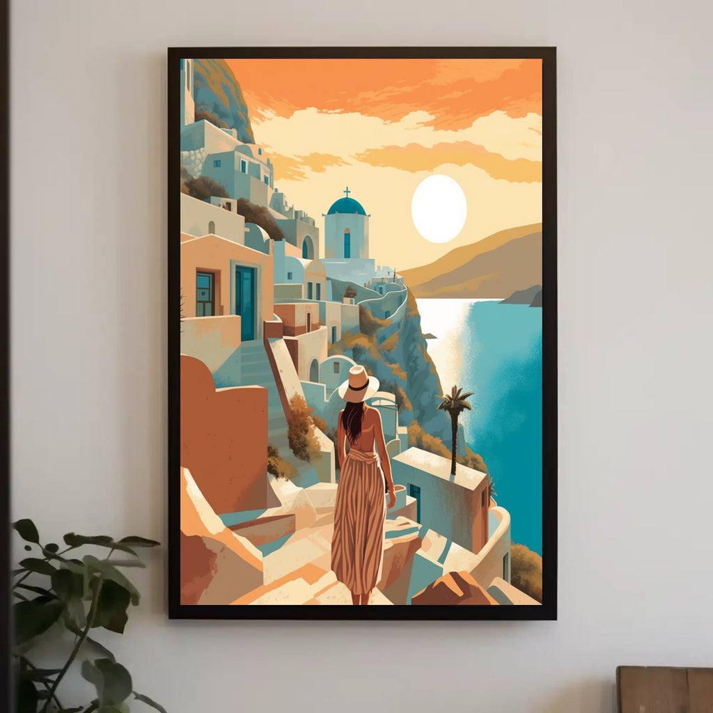 Serene Sunset Over Santorini Travel Poster from PosterGoat captures the timeless romance of the Aegean in a single, evocative print. A sun-drenched travel illustration depicts whitewashed cliffs, a signature blue-domed church, winding terraces and a lone figure in a straw hat gazing toward the turquoise sea — a picture-perfect blend of mid-century minimalism and vibrant, modern color.