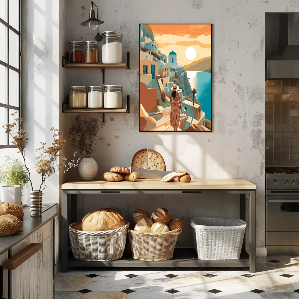 Why choose this poster? It’s an instant mood-lifter that transports any room to a sunlit Santorini terrace — ideal for wanderlust decor, beach house art, or as a romantic escape on your wall.