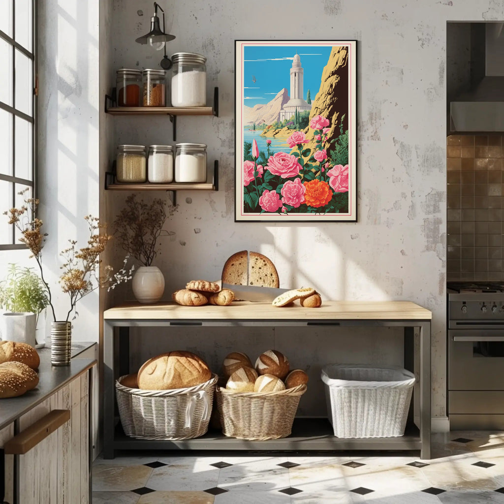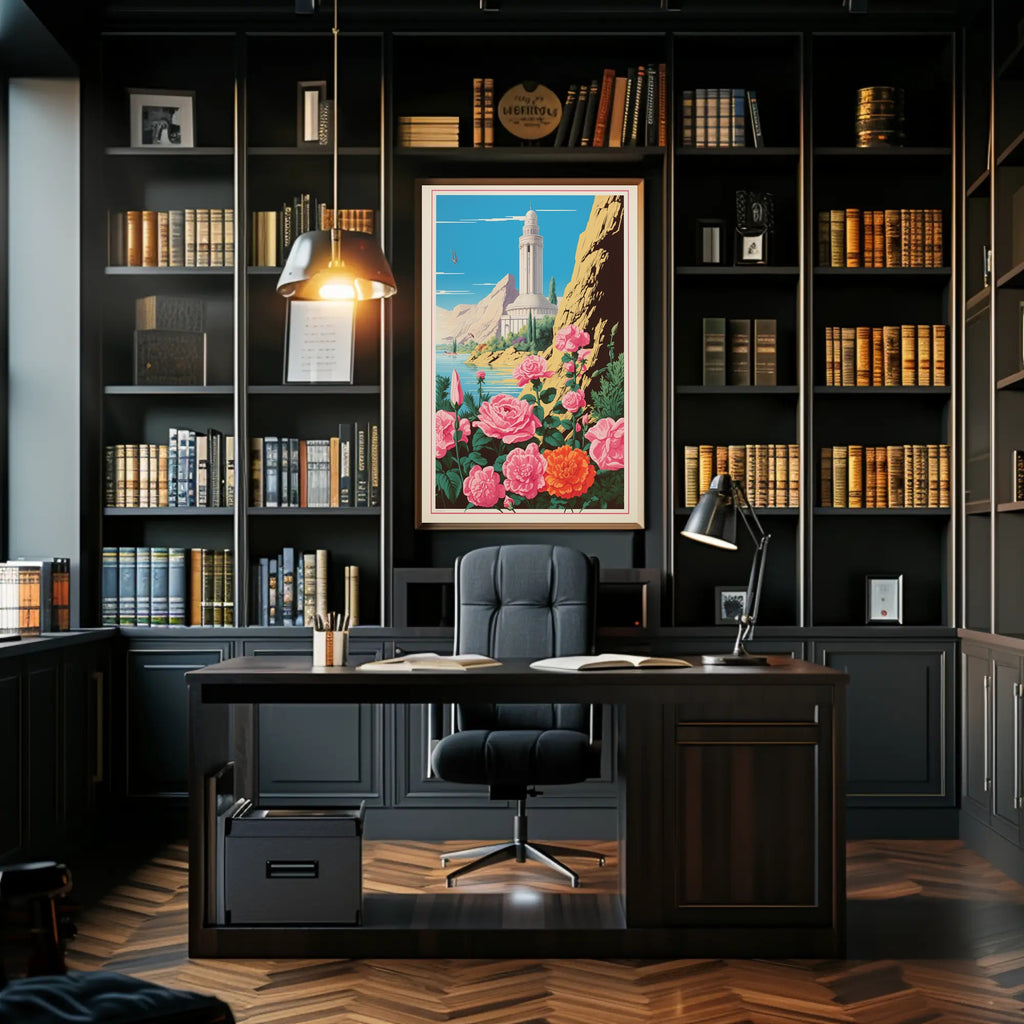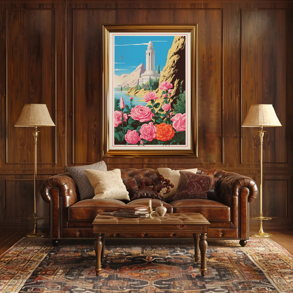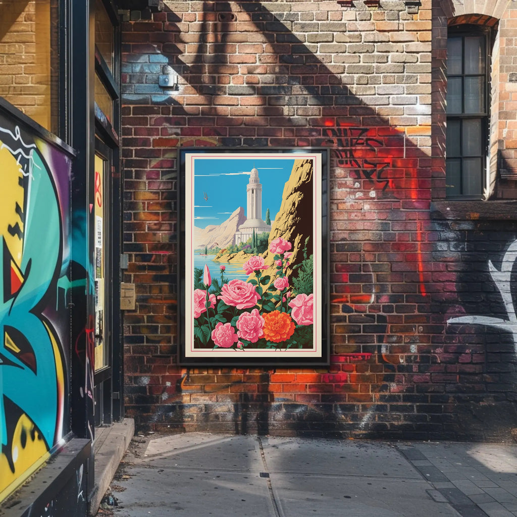 Bring coastal nostalgia and mid-century charm to your walls with the Serene Tower and Roses Vintage Travel Poster from PosterGoat. This illustrative, poster-style print showcases a classical white tower rising above rocky cliffs, a calm turquoise bay, and an exuberant foreground of pink roses — a peaceful travel scene rendered in bold, vintage colors that instantly elevates any room.