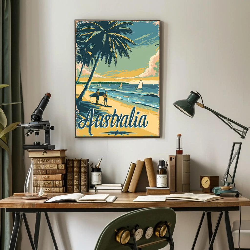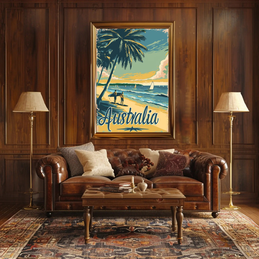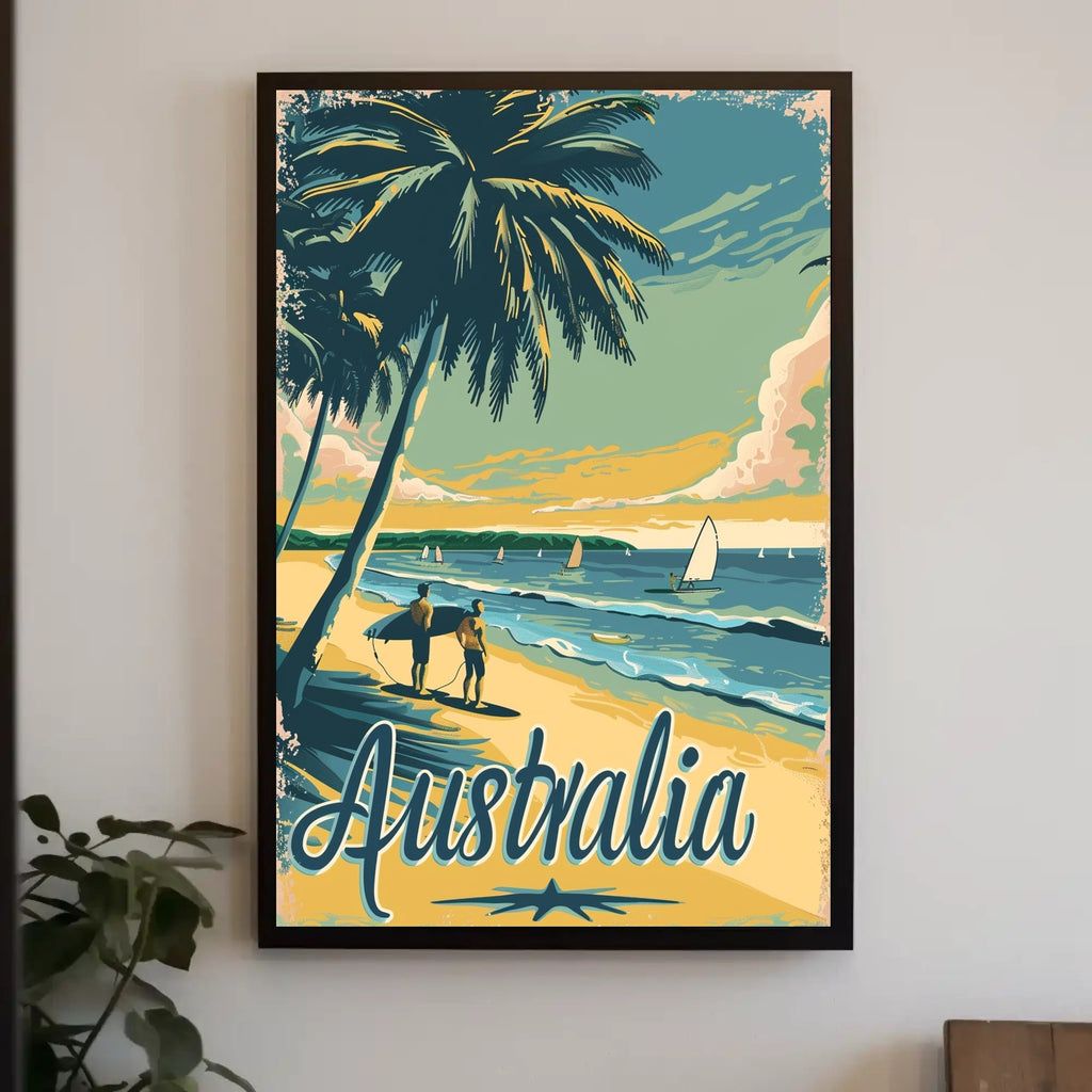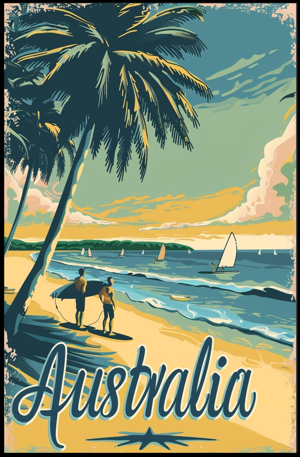 Step into a tranquil Australian paradise with this vintage-inspired beach poster. Capturing the essence of mid-20th-century travel art, it features two surfers walking the sandy shores, their surfboards poised for adventure. Sailboats dot the clear blue waters, while picturesque palm trees sway gently, evoking a sense of relaxation and exploration. The soft, muted colors lend a nostalgic charm, perfect for those yearning for a laid-back beach vacation. Ideal for bringing a soothing, adventurous vibe to any space, this poster is a timeless tribute to Australia’s coastal allure and natural beauty.