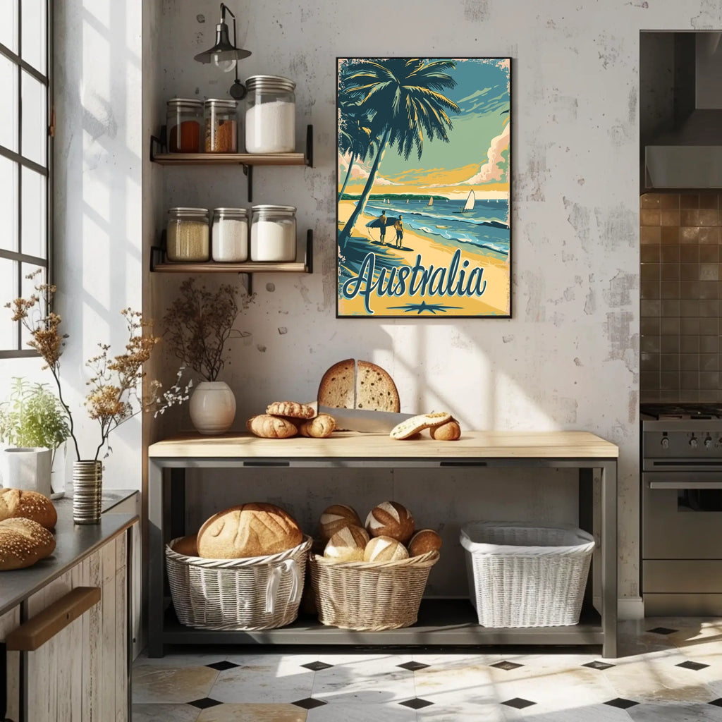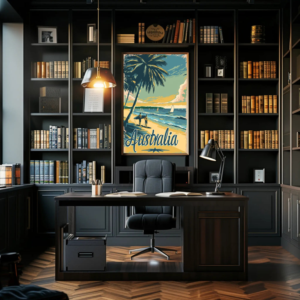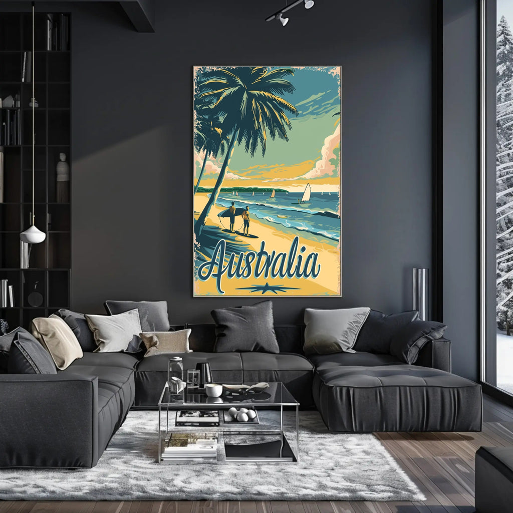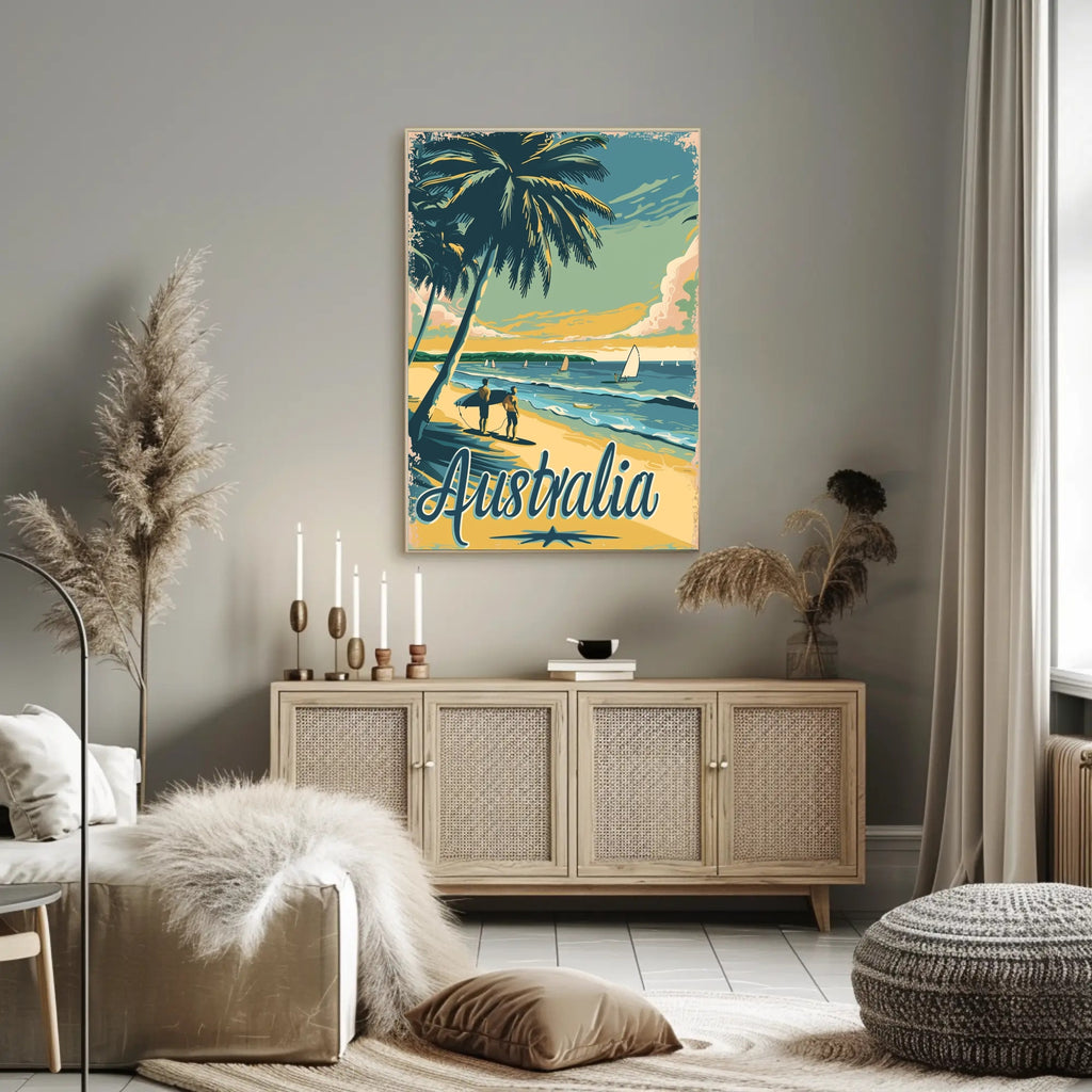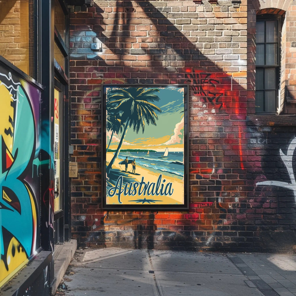 Step into a tranquil Australian paradise with this vintage-inspired beach poster. Capturing the essence of mid-20th-century travel art, it features two surfers walking the sandy shores, their surfboards poised for adventure. Sailboats dot the clear blue waters, while picturesque palm trees sway gently, evoking a sense of relaxation and exploration. The soft, muted colors lend a nostalgic charm, perfect for those yearning for a laid-back beach vacation. Ideal for bringing a soothing, adventurous vibe to any space, this poster is a timeless tribute to Australia’s coastal allure and natural beauty.