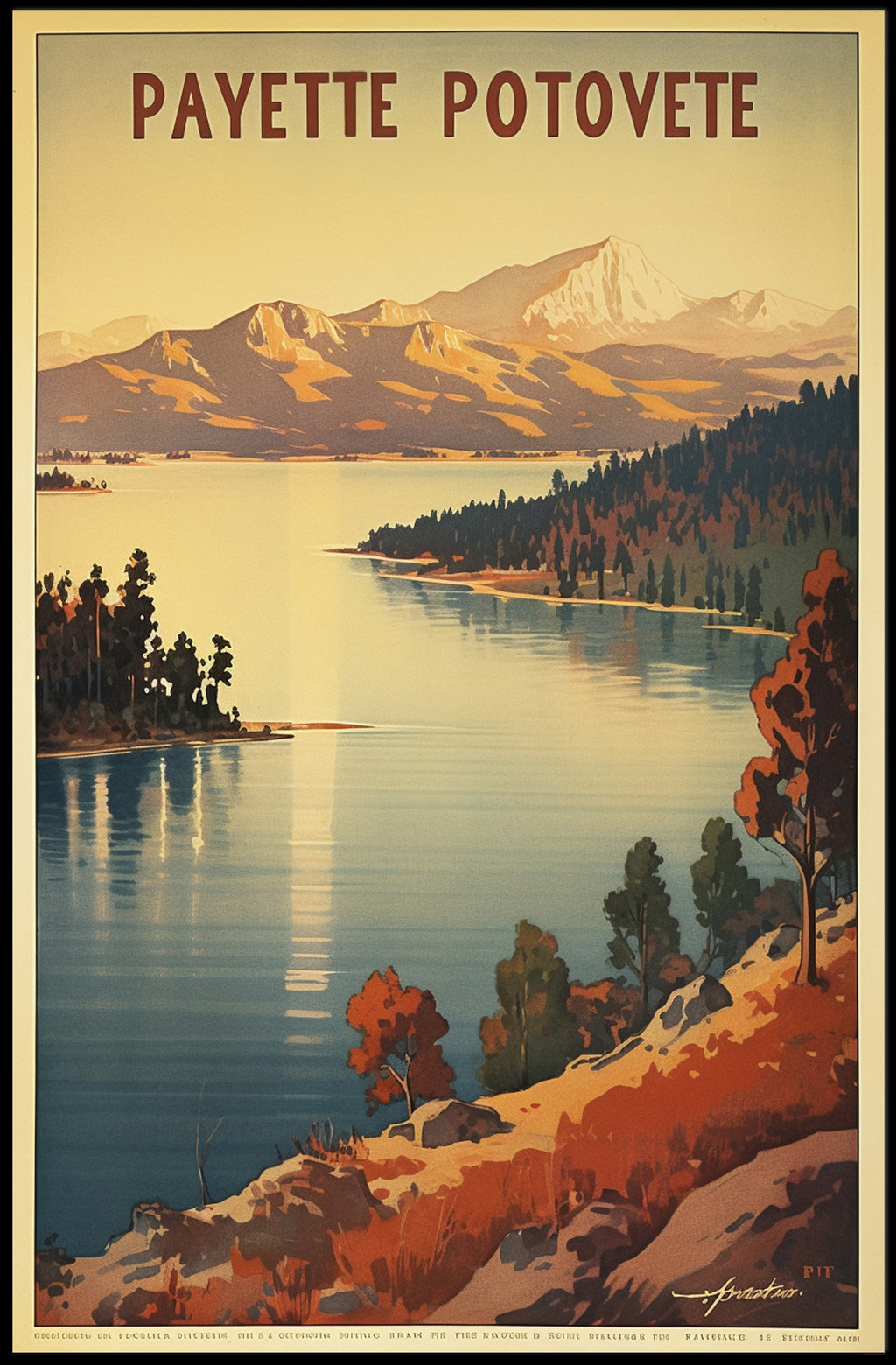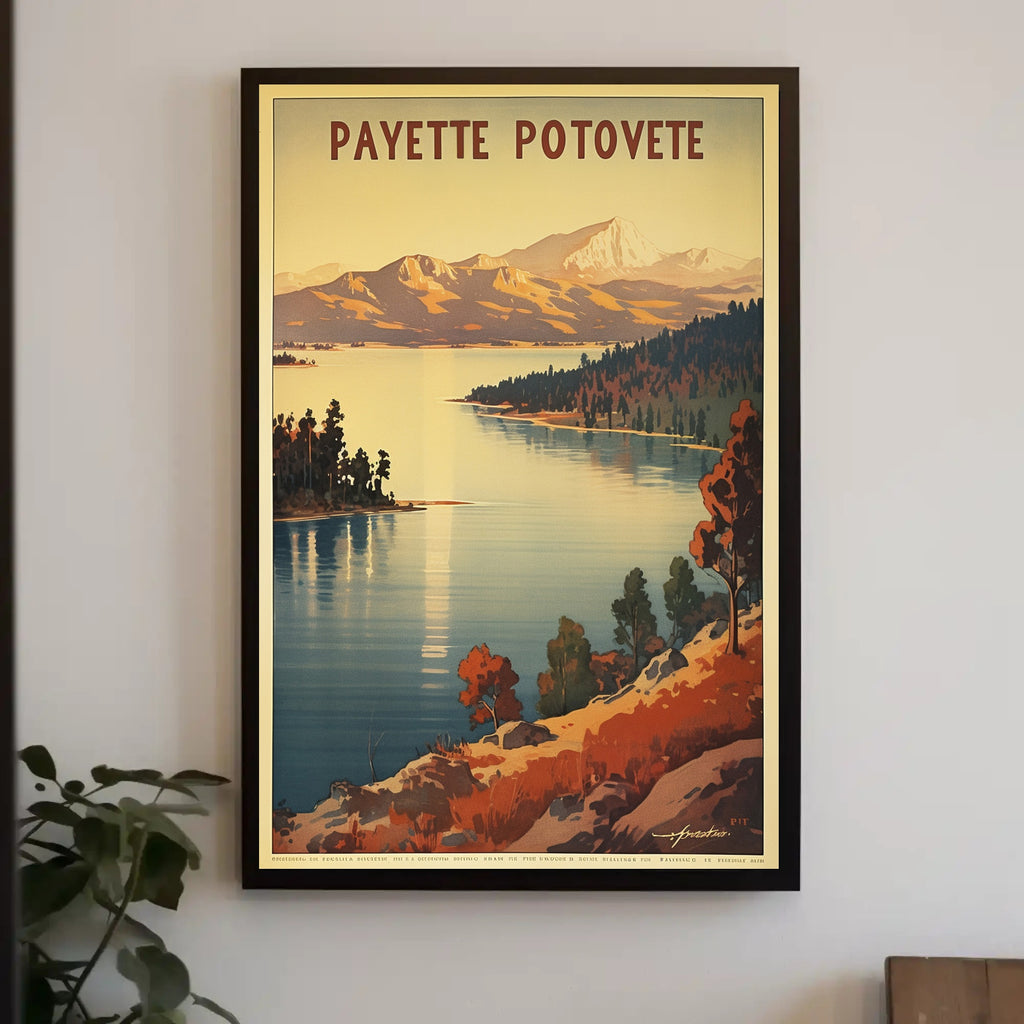 Capture the essence of untouched nature with this beautifully designed poster, featuring a tranquil lake framed by lush forested hills and majestic distant mountains. The landscape evokes the beguiling wilderness of North America, potentially set in the idyllic surroundings of Payette National Forest. Rendered in a vintage art style reminiscent of early 20th-century travel posters, the use of warm earthy tones creates an inviting atmosphere that stirs the spirit of adventure and peace. This poster is perfect for outdoor enthusiasts and nature lovers, showcasing the enchanting serenity and grandeur of the natural world, making it a timeless piece of art.