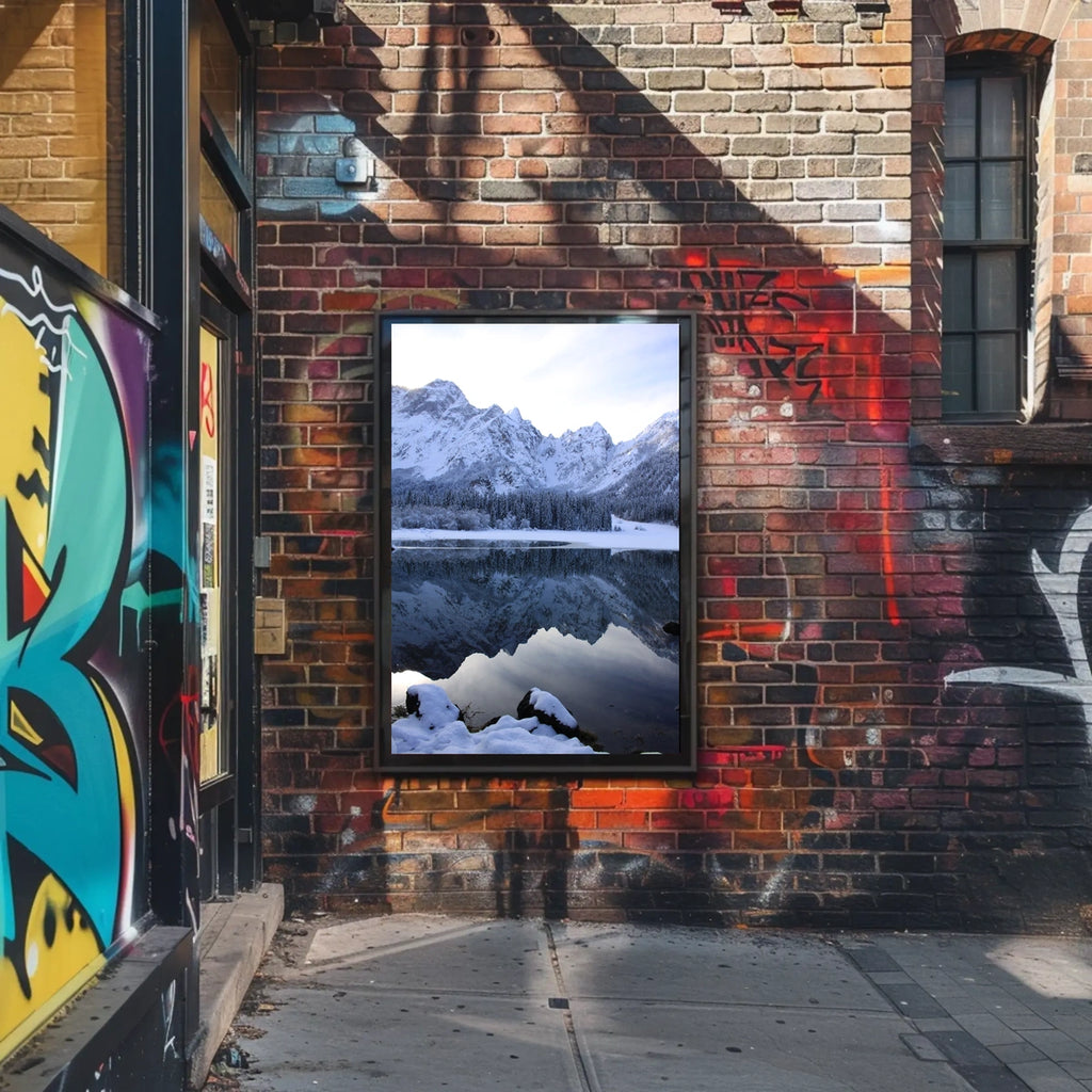 Serene Winter Lake Scene in National Park Poster captures the serene beauty of a winter landscape, inviting you into a tranquil world where nature reigns supreme. Dominated by majestic, snow-capped mountains, the scene is reflected perfectly in the mirror-like surface of a pristine lake. A dense line of snow-dusted evergreen trees hugs the shoreline, framed by the rugged peaks that tower beyond. The photorealistic style brings every detail to life, from the crispness of the snow to the clarity of the reflections. This poster's peaceful mood embodies purity and untouched beauty, making it a perfect piece for nature enthusiasts.
