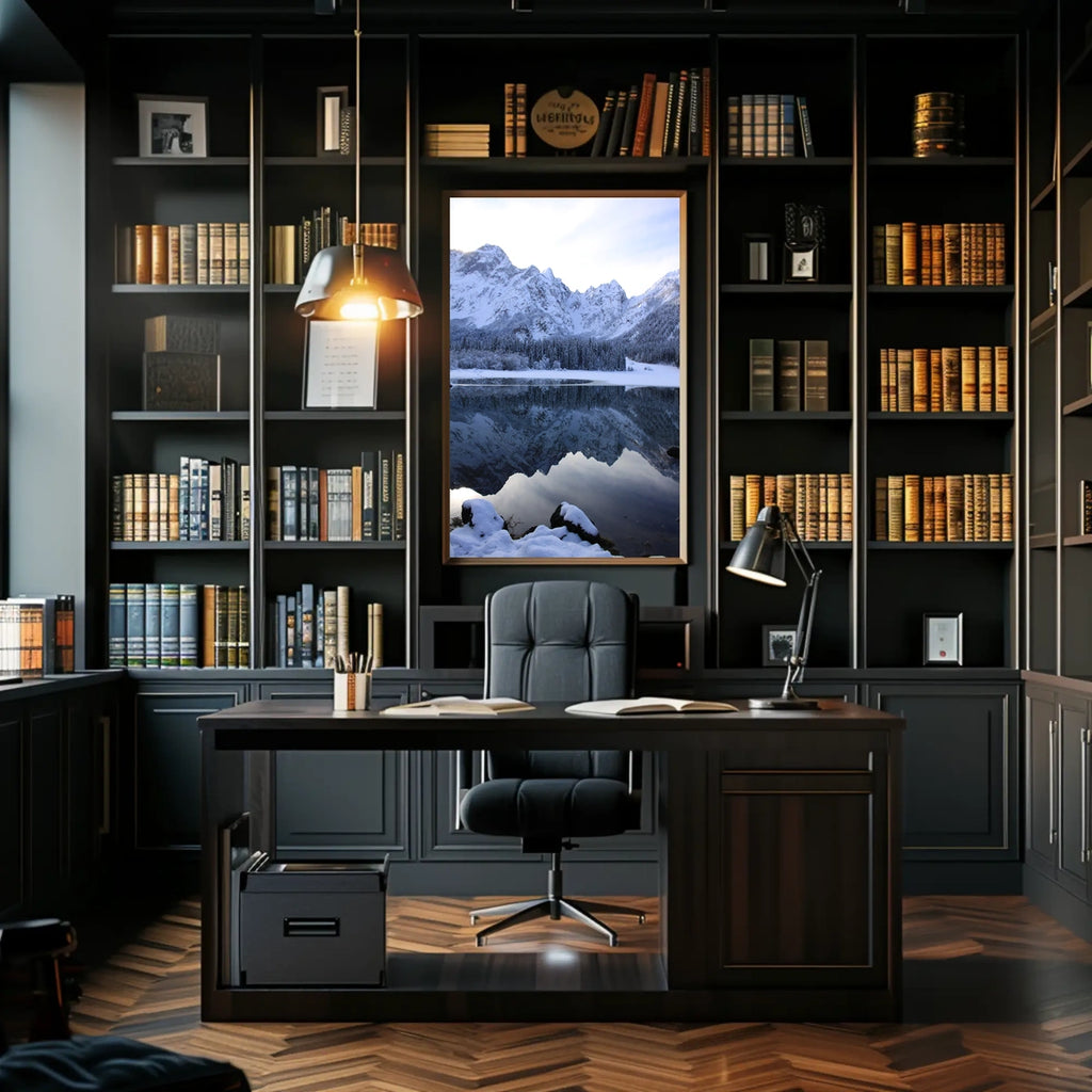 Bring the Serene Winter Lake Scene in National Park Poster into your home, classroom, or office today and let your walls tell a powerful story. This nature wall art embodies the essence of a peaceful, tranquil winter landscape—perfect for fans of evergreen trees poster, mountain reflection print, national park print, and photorealistic nature art.