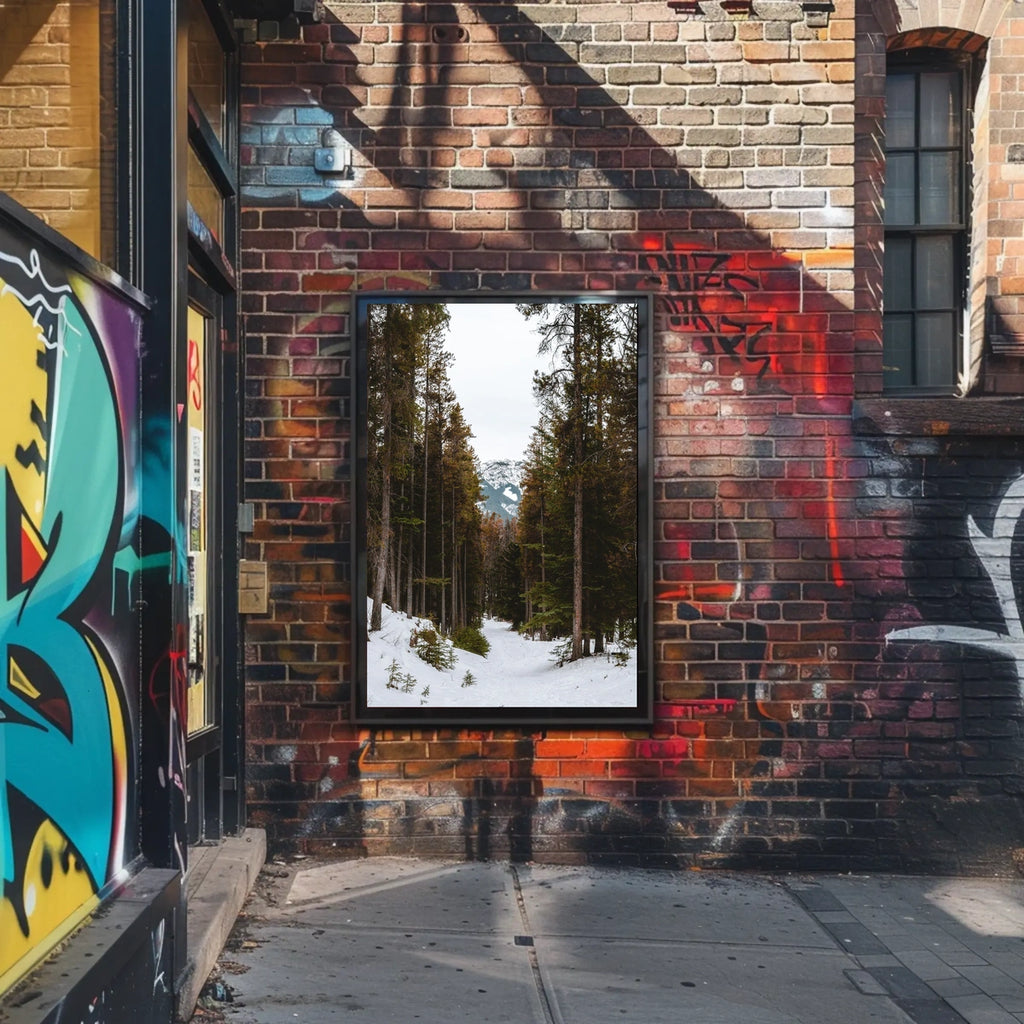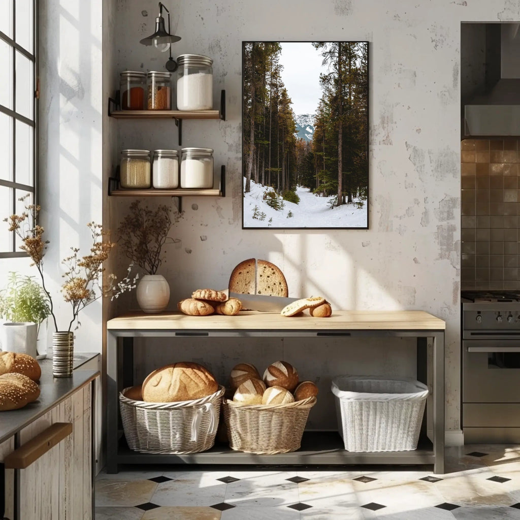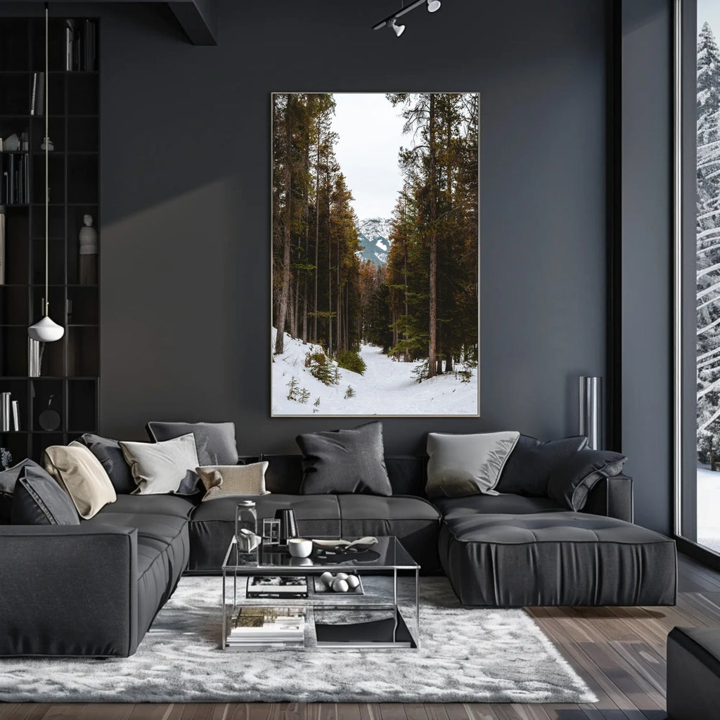 Detailed design highlighting a snow-covered path winding through a dense forest and the distant, majestic mountains
