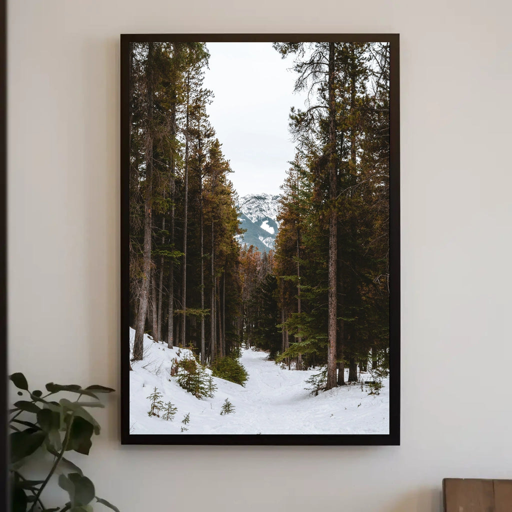 Immerse yourself in the tranquility of a serene winter landscape with this realistic and atmospheric Serene Winter Landscape National Park Poster. A snow-covered path meanders through a dense forest under the watchful gaze of towering, snow-capped mountains. The composition captures the majesty of nature in a setting reminiscent of a wilderness or national park, known for its breathtaking beauty and potential for winter sports. Cool tones of snow blend harmoniously with earthy hues of trees, crafting a peaceful and adventurous scene. This poster offers a perfect escape into nature's calm, inviting exploration and tranquility into any space.