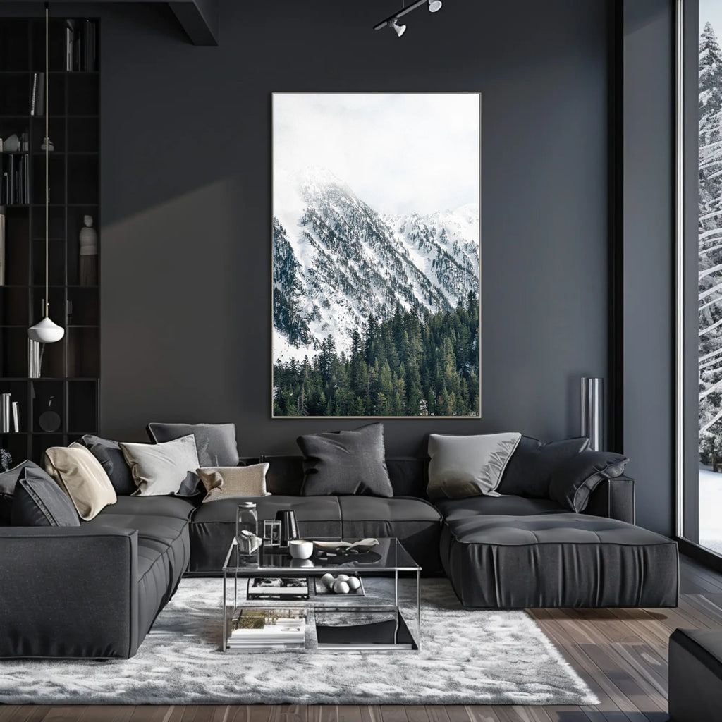 - Detailed design highlighting the wintry landscape: snow-covered mountains, dark coniferous trees, and a lush green forest in the foreground.