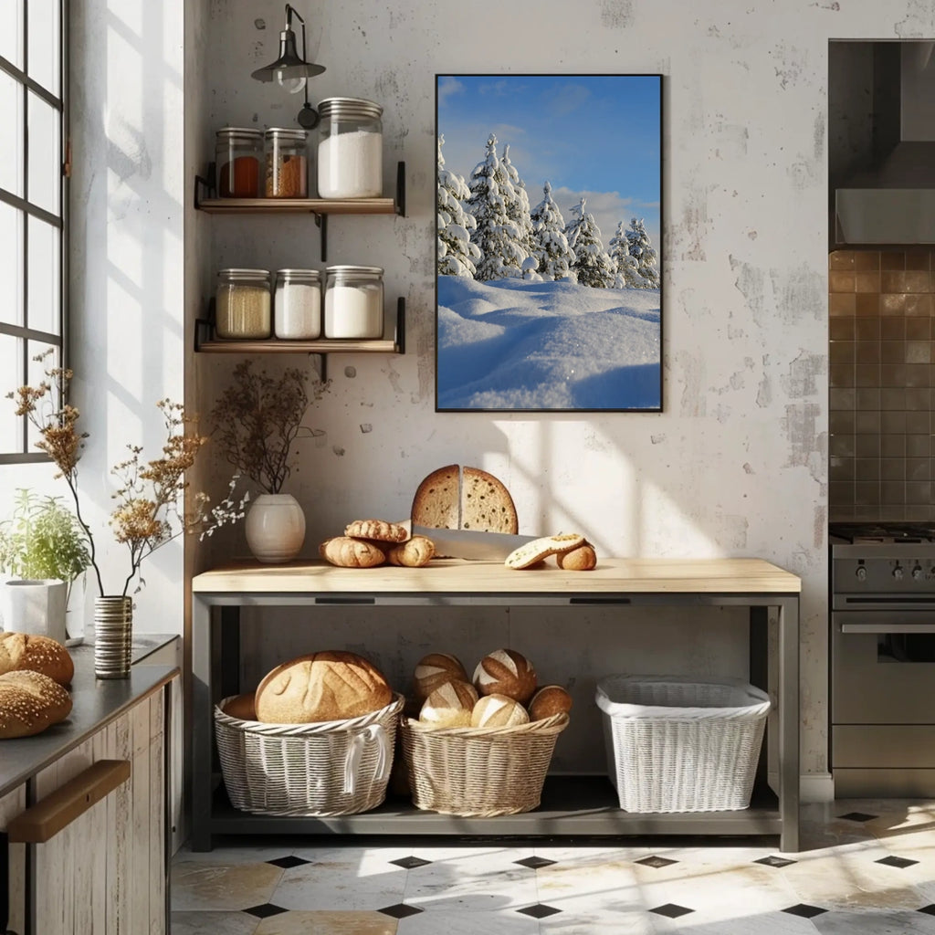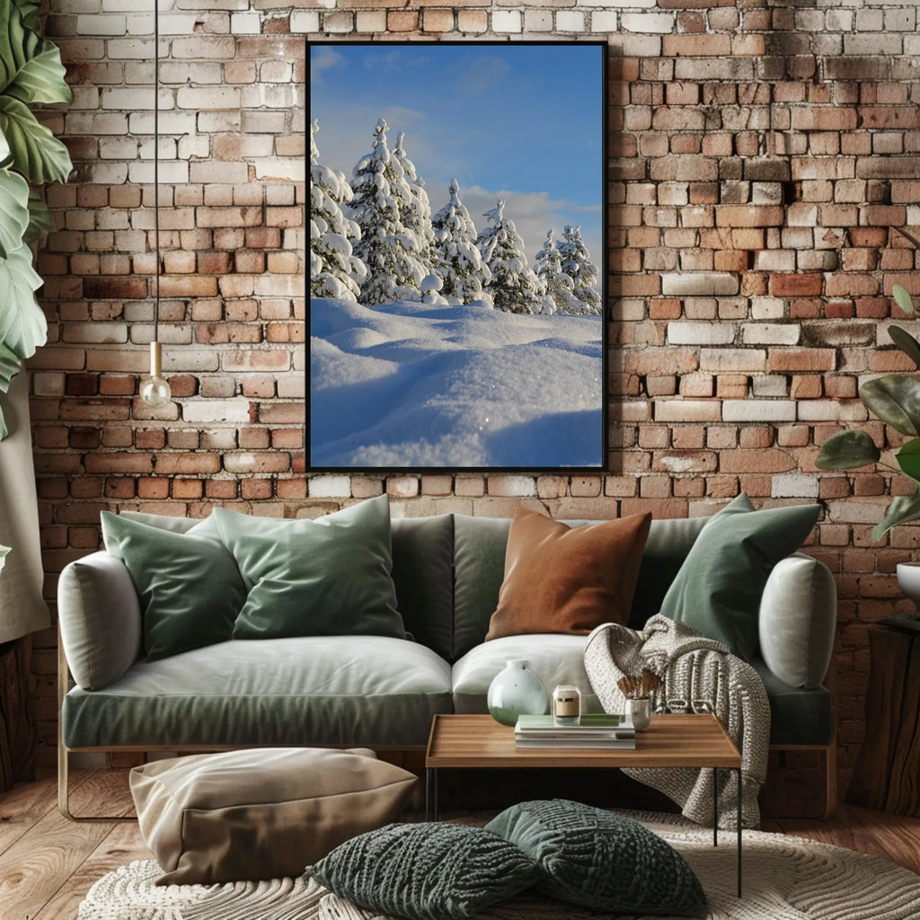 Serene Winter Landscape with Evergreen Trees National Park Poster captures the tranquil beauty of a snow-kissed forest under a vivid blue sky. This photorealistic art poster highlights glistening snow and evergreen trees, delivering a serene winter landscape that brings calm and quiet beauty to any room or office. Ideal for nature enthusiasts and lovers of natural elegance, this National Park poster adds winter decor with lasting appeal.