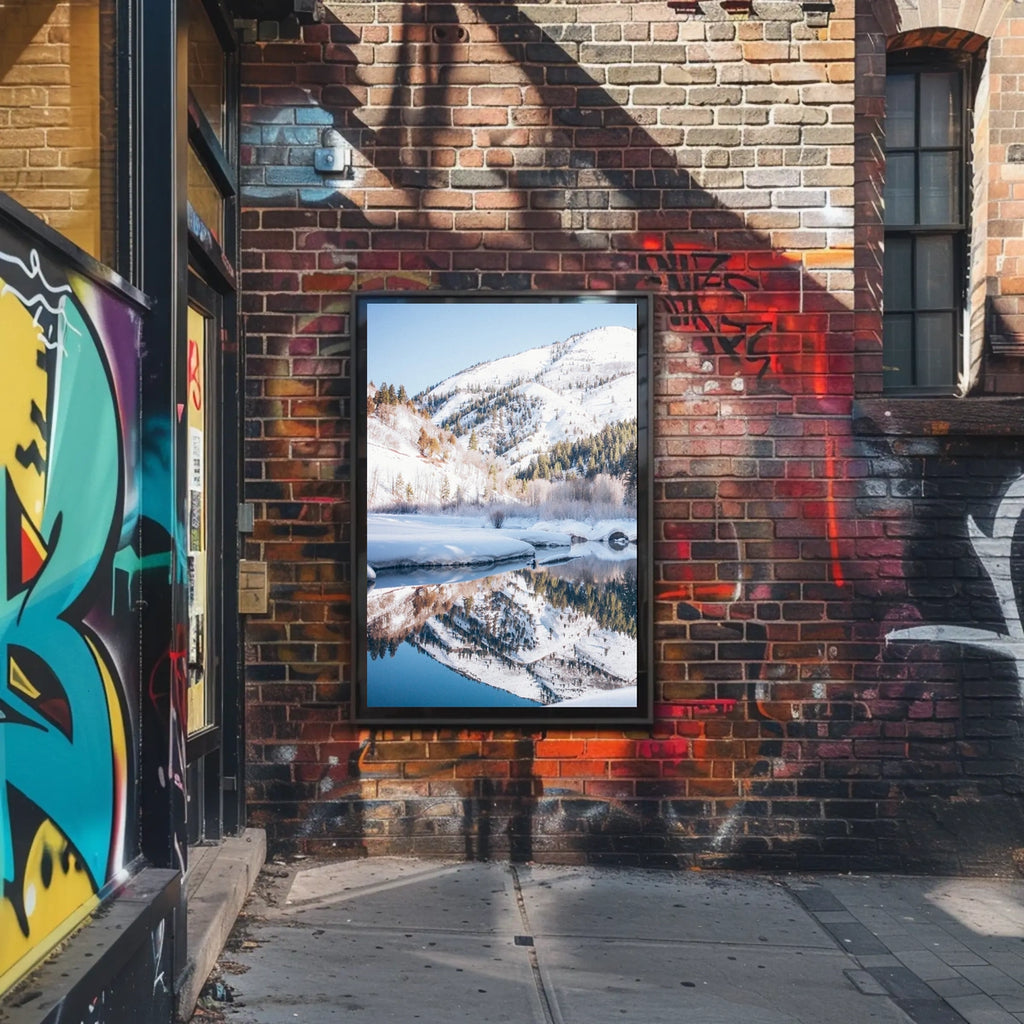 Serene Winter Mountain Reflection National Park Poster is a photorealistic homage to winter's quiet grandeur. This wall art captures a calm nature poster showcasing a national park winter scene, with a snow-blanketed mountainside perfectly reflected in a tranquil lake. Snow-laden trees scatter across the hillside, contributing to a symmetrical, serene mountain view that invites viewers to immerse themselves in nature's untouched artistry. This piece evokes a deep sense of calm and tranquility, celebrating the quiet majesty of the winter season. Ideal for nature lovers and those seeking a peaceful ambiance, this poster is an exquisite reminder of the untouched natural beauty found within national parks during wintertime.