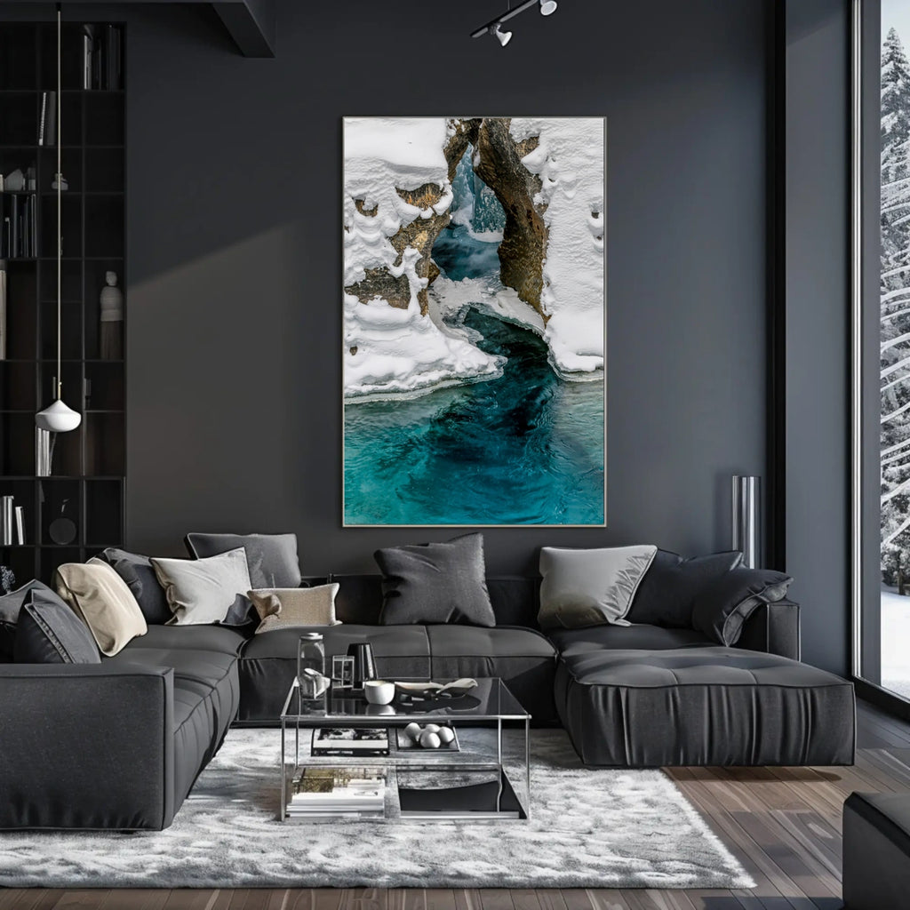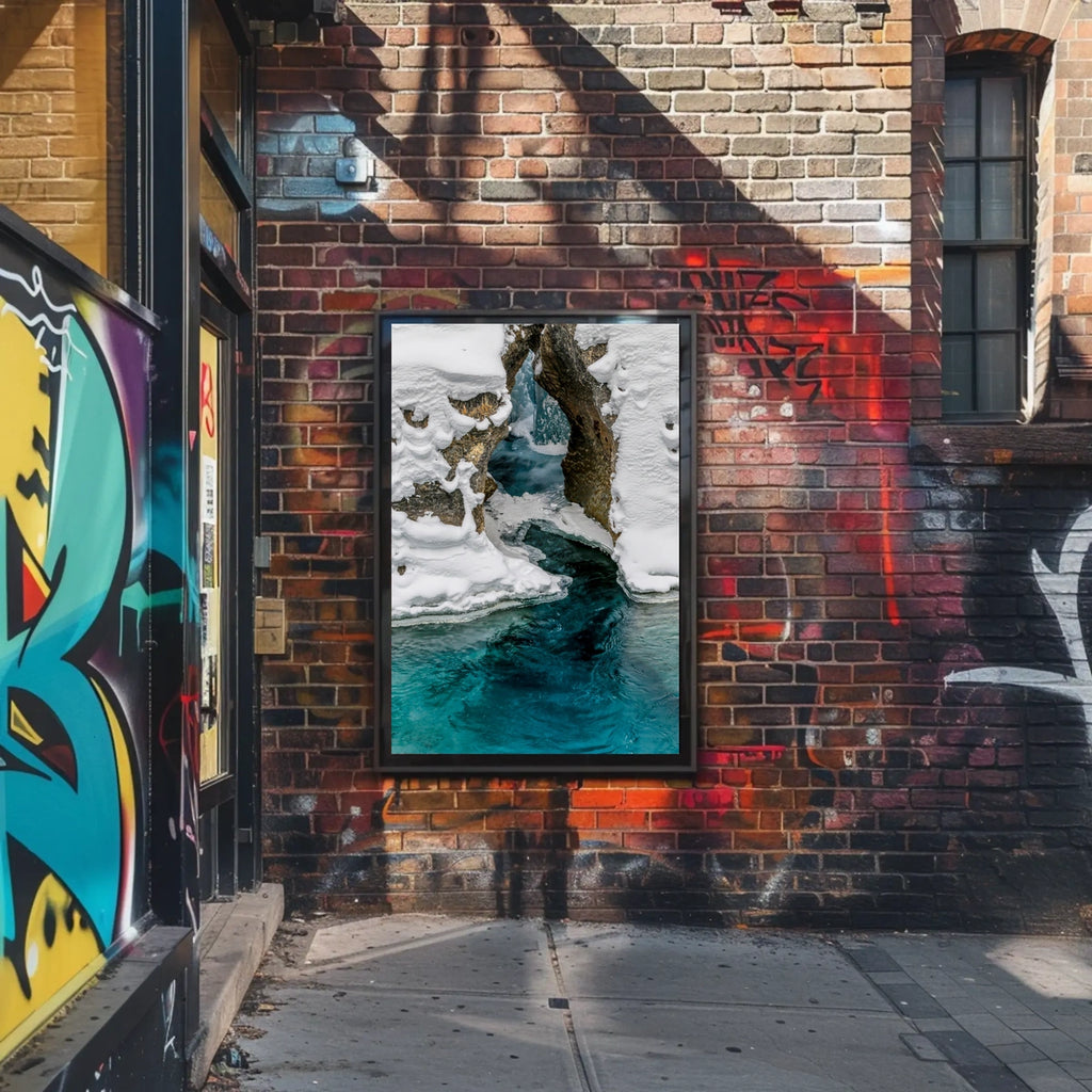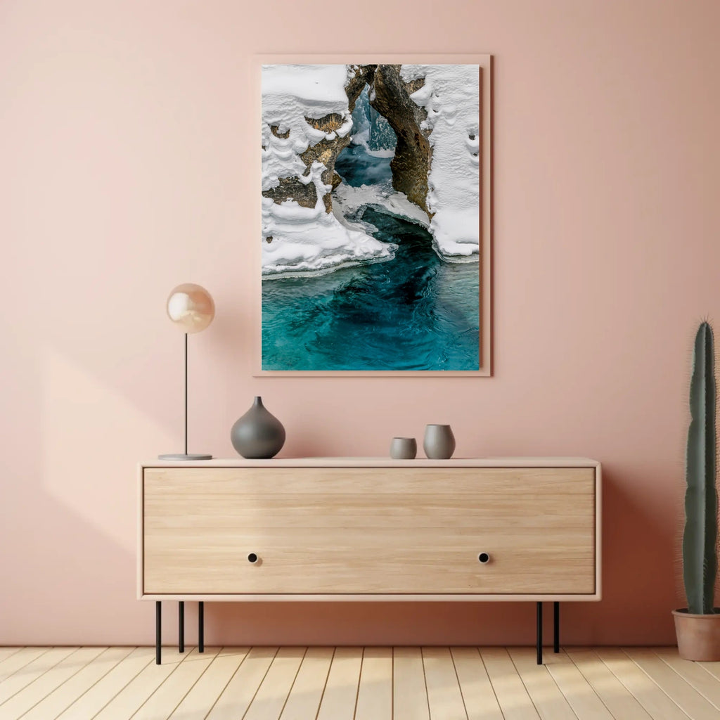 Celebrate the beauty of this timeless wall art. Designed to capture its unique appeal, this piece is perfect for collectors, enthusiasts, or anyone who wants to bring meaning and inspiration into their space. This photorealistic poster showcases a breathtaking winter landscape where nature’s beauty shines through an icy archway spanning a turquoise river, with snow-covered rocks adding texture and depth. The cool blues and whites evoke peace, serenity, and the pristine allure of winter—an ideal addition for nature lovers and art enthusiasts alike.