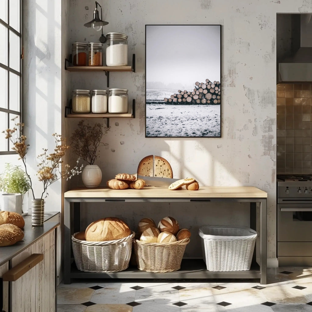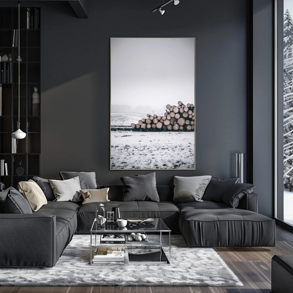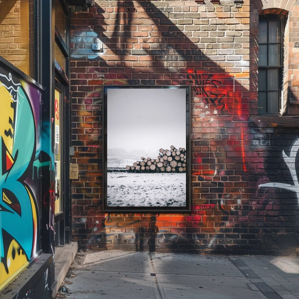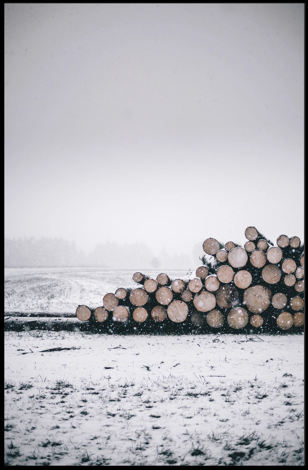 Capture the essence of tranquility with a breathtaking snowy landscape. This modern, realistic image showcases a large pile of timber logs in the foreground, beautifully blanketed by softly falling snow. In the background, snow-covered fields and a distant line of blurred trees add to the serene setting, inviting introspection. The artist skillfully utilizes natural light and detailed textures to evoke a peaceful and solitary winter ambiance.