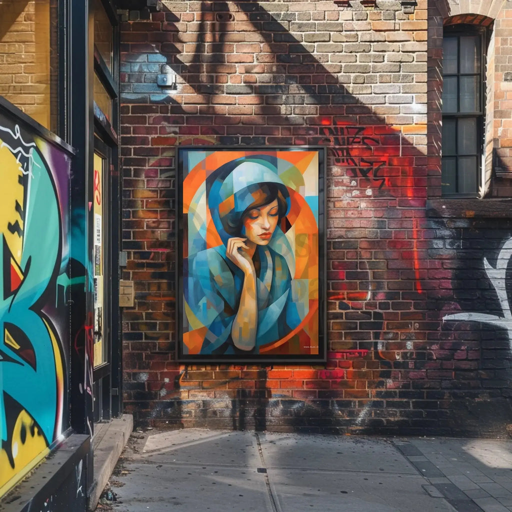 - Distinctive cubist composition: Layered geometric shapes form a contemplative female form cloaked in cool blues, contrasted with vibrant oranges and warm accents for powerful visual depth and movement.