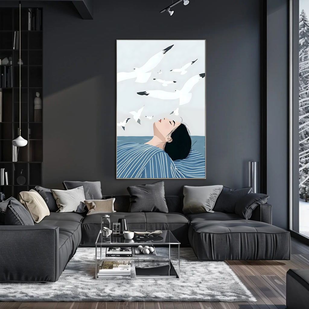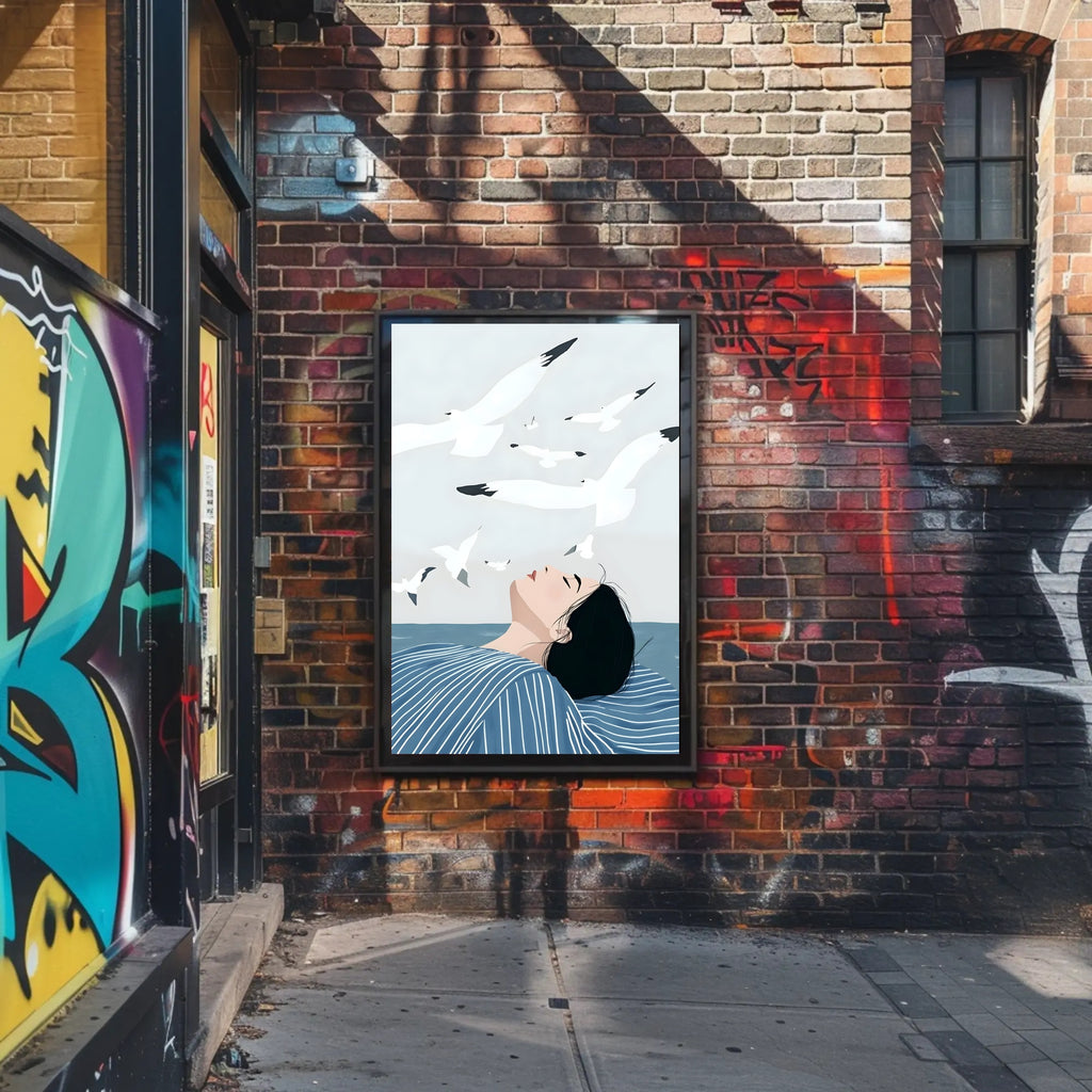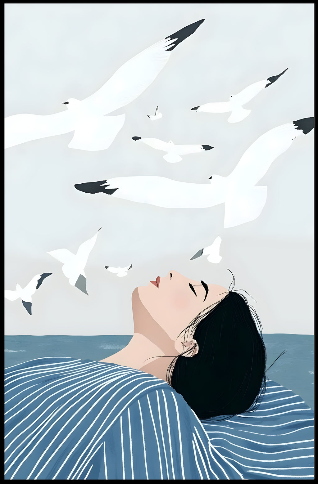 Transform any room into a coastal calm zone. This minimalist poster from PosterGoat captures a tranquil seaside moment: a relaxed figure reclining against a striped blue blanket with eyes closed while white seagulls glide overhead against a soft, cloudy sky. The artwork's clean lines, muted palette, and breezy composition make it an effortless focal point for living rooms, bedrooms, or home offices.