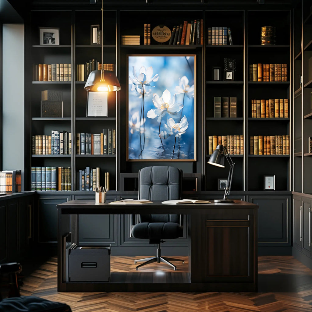Tranquil imagery: Crisp white petals and slender stems rise from shimmering water, creating a serene focal point that complements modern and Scandinavian interiors.