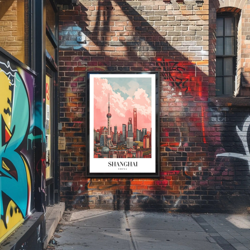 Experience the vibrant pulse of Shanghai's skyline with this captivating illustrative art poster. Brilliantly capturing the Oriental Pearl Tower and Shanghai Tower, it features a vivid sky backdrop with fluffy clouds, embodying a modern and dynamic aesthetic. This poster vividly celebrates Shanghai's blend of futuristic architecture and bustling urban life. Its bold, illustrative style offers a detailed portrayal, making it a striking addition to any space. Perfect for those who admire cityscapes and the ever-evolving urban environments. Bring the essence of Shanghai's architectural marvels into your home with this dynamic piece.
