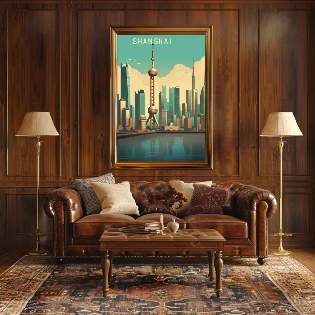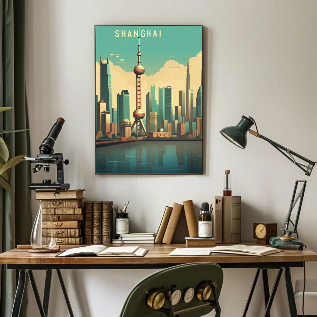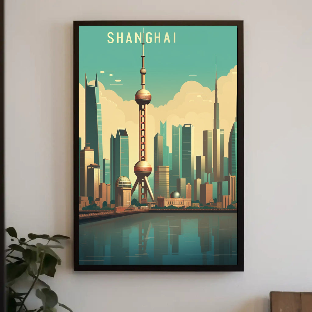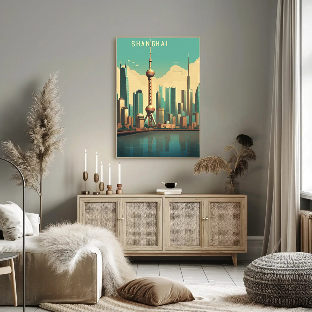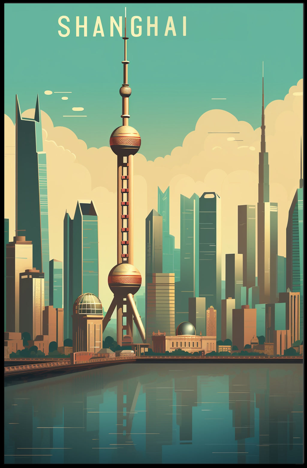 Bring the energy of one of the world's great metropolises into your home with the Shanghai Skyline: Modern Urban Cityscape Poster from PosterGoat. This striking print centers the iconic Oriental Pearl Tower against a teal sky, layered clouds and a reflective riverfront — a clean, mid-century modern interpretation of Shanghai's dense skyline rendered in warm, inviting tones.