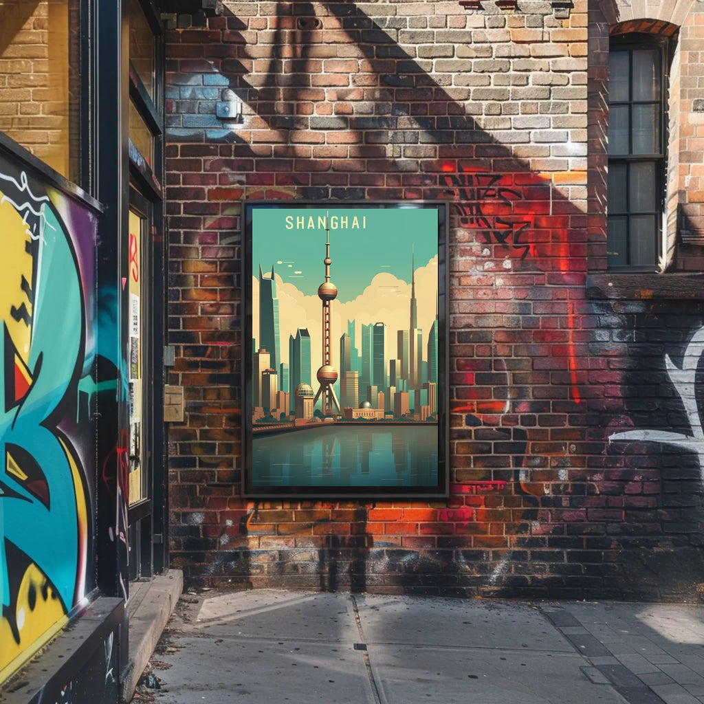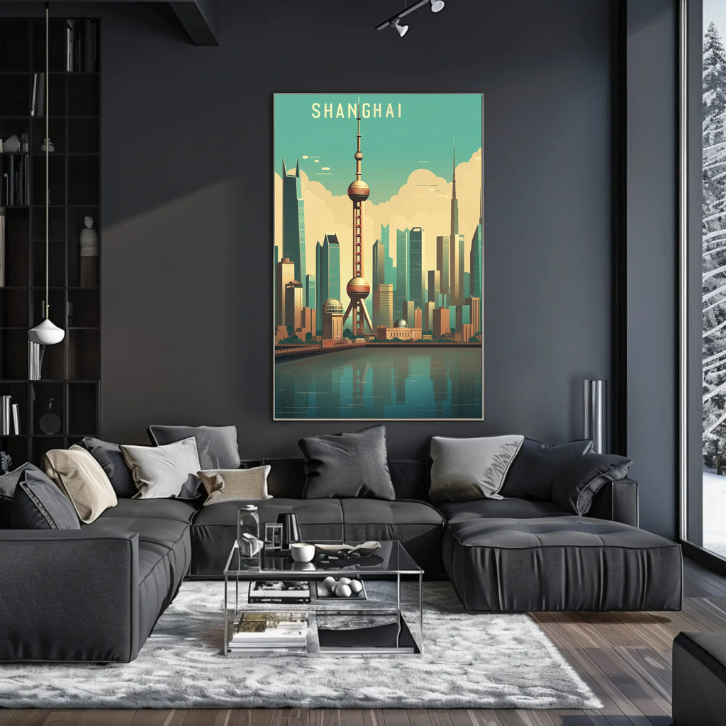 Blending minimalist line art with illustrative depth, the artwork emphasizes architectural forms and bold silhouettes: towering skyscrapers, geometric domes, and the unmistakable sphere-and-column profile of the Oriental Pearl Tower. The poster's subtle reflections and soft gradients create a calm yet dynamic focal point perfect for living rooms, offices, or travel-themed galleries.