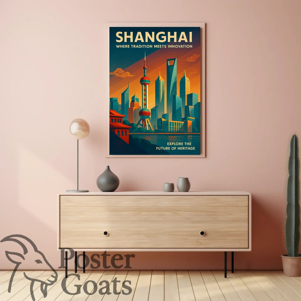 Immerse yourself in the captivating allure of Shanghai with this stunning poster, highlighting the city's unique fusion of tradition and modernity. The design masterfully captures the iconic Shanghai skyline, featuring landmarks like the Oriental Pearl Tower amidst a futuristic cityscape. Bold geometric lines meet vibrant hues of orange, blue, and green, creating an energetic and arresting visual. The Art Deco influences interwoven with traditional Chinese architectural elements emphasize Shanghai's role as a beacon of progress and cultural richness. Perfect for art enthusiasts and admirers of dynamic cityscapes, this poster is a tribute to Shanghai's ever-evolving story.