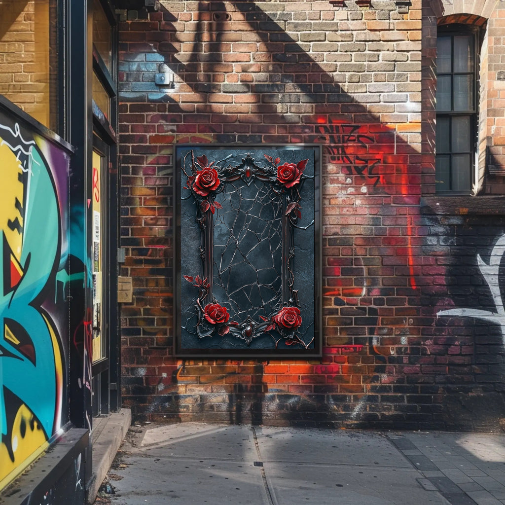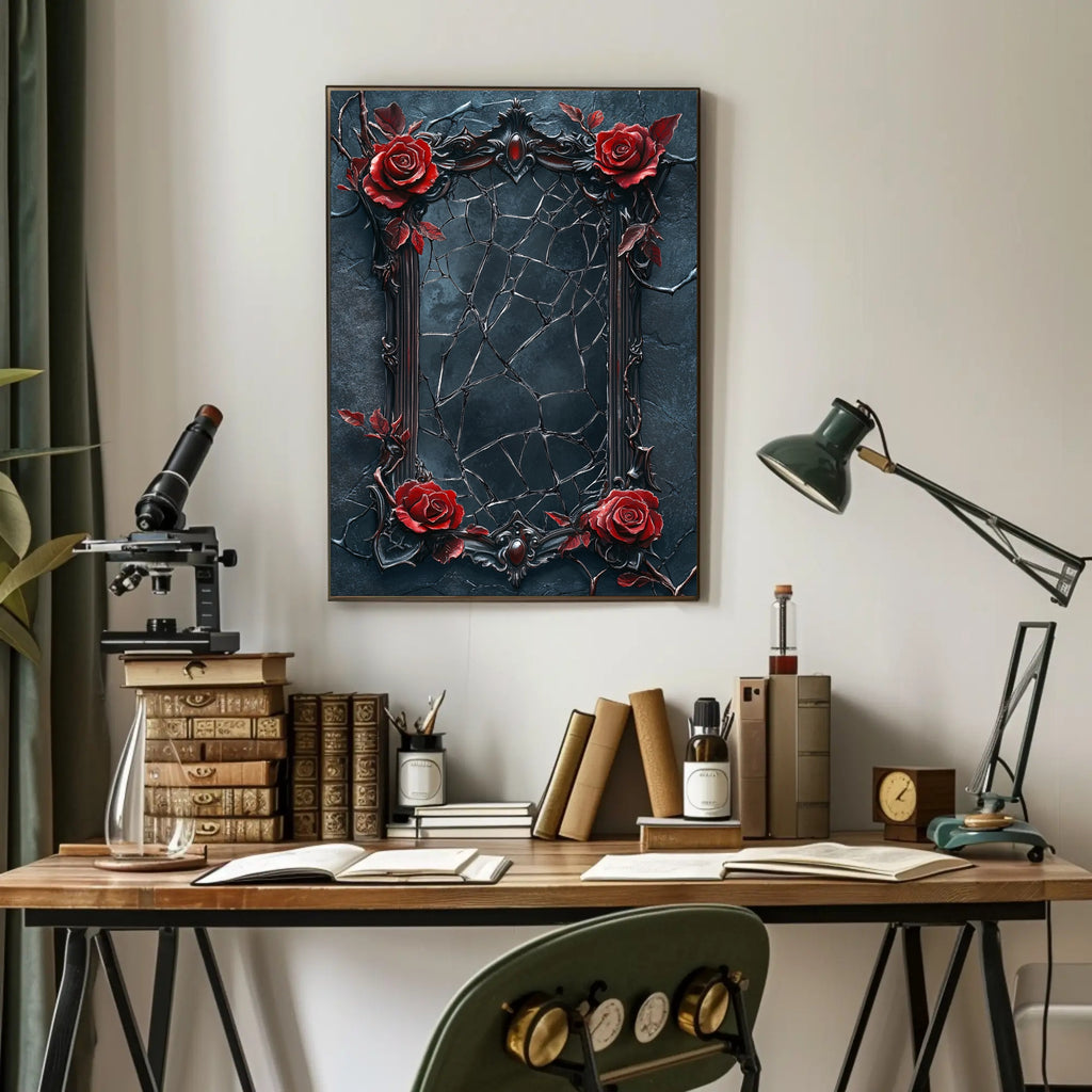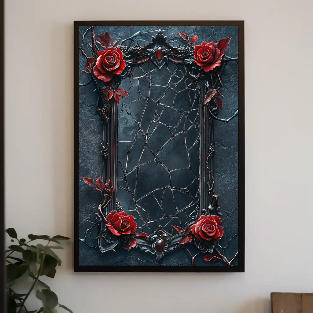 Bring a bold statement to your walls with the Shattered Reflections Poster from PosterGoat — a dramatic, minimalist artwork that marries gothic romance with modern decor. This striking print features an ornate, cracked mirror motif set against a textured slate background, framed by sculpted filigree and vivid red roses that pop with lifelike depth and contrast.