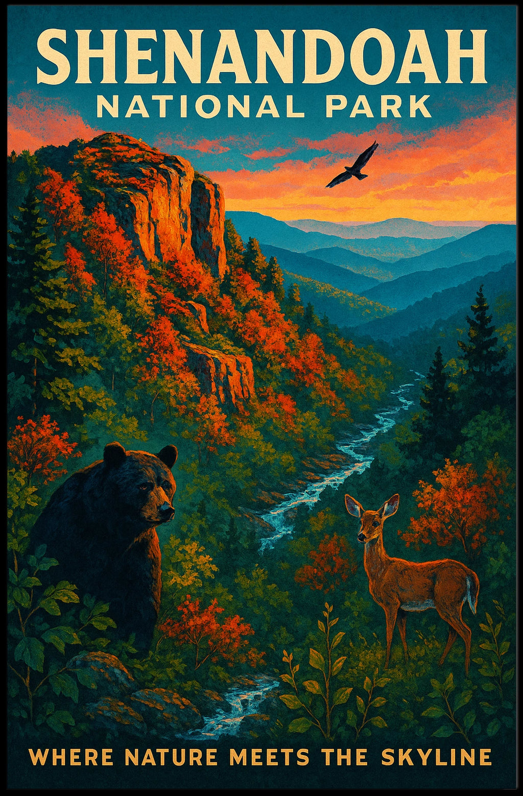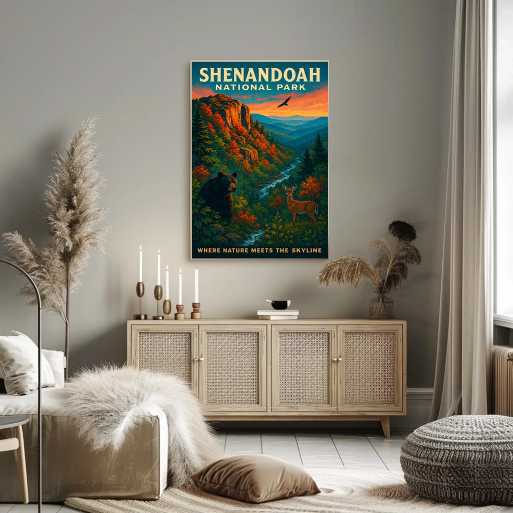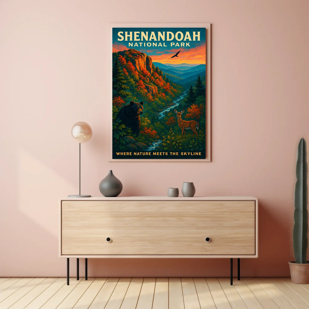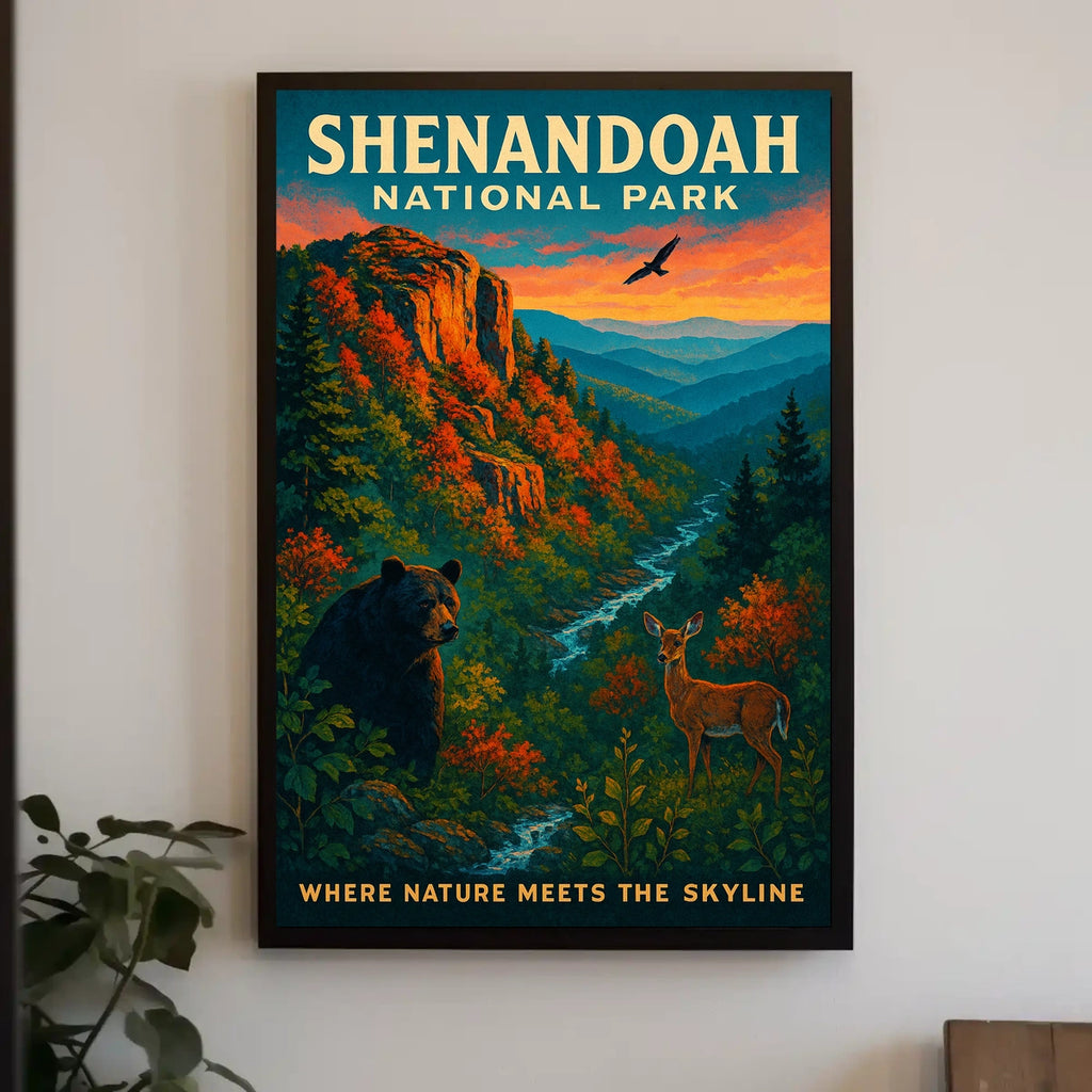 Celebrate Shenandoah National Park with this striking poster that captures the park’s quiet grandeur. From golden autumn foliage to sweeping mountain vistas and winding trails, it brings the season’s serenity and the beauty of nature into any space.