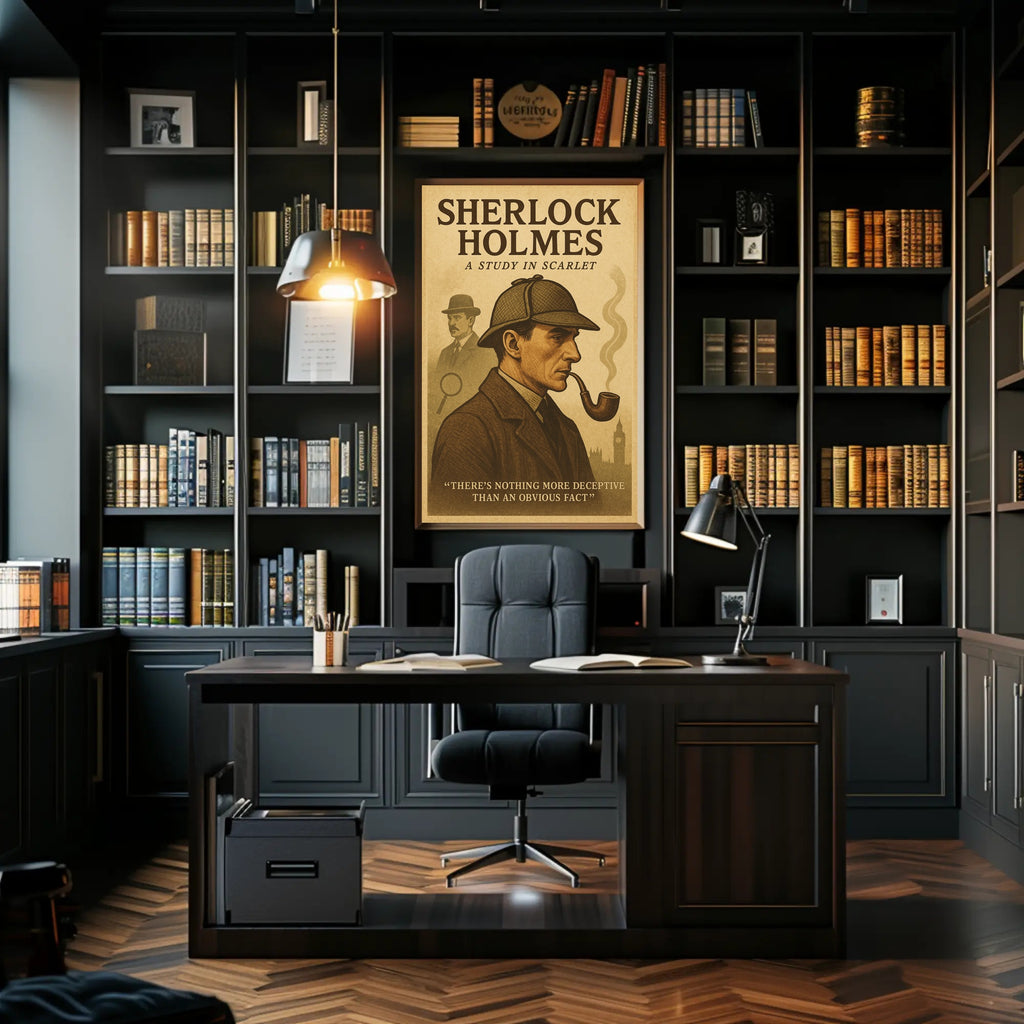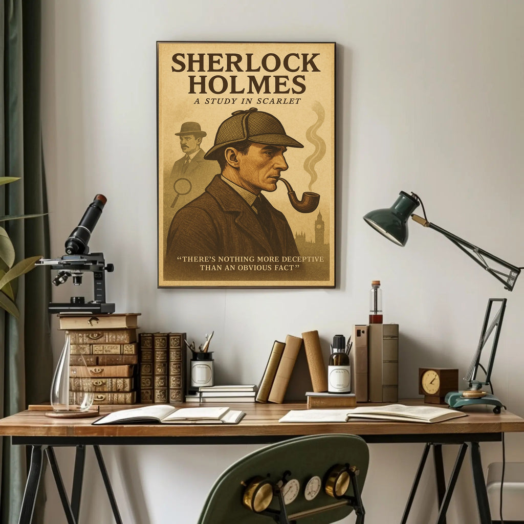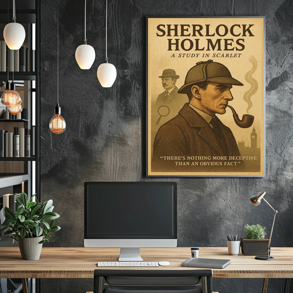 Why you'll love it: The poster's aged-paper texture and warm, muted palette create an authentic retro feel that complements modern and traditional interiors alike. The composition features a strong profile of Holmes, the memorable quote “There’s nothing more deceptive than an obvious fact,” and period details that reward close inspection—making it an excellent conversation piece for living rooms, studies, libraries, and office walls.