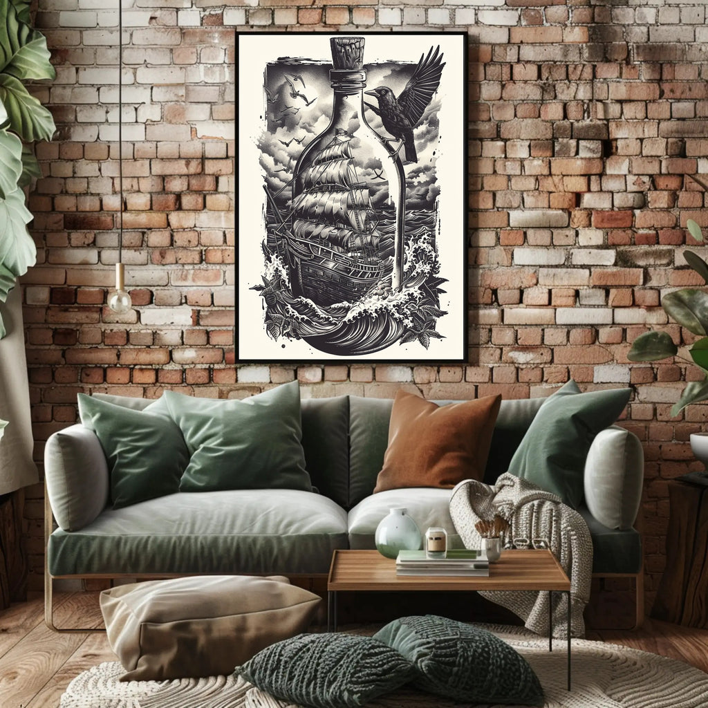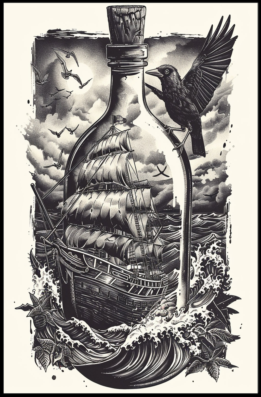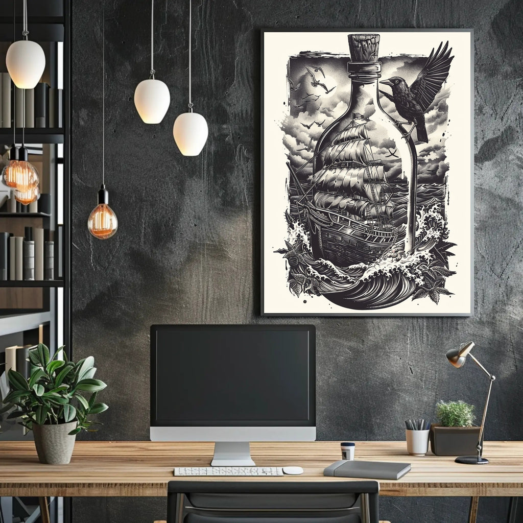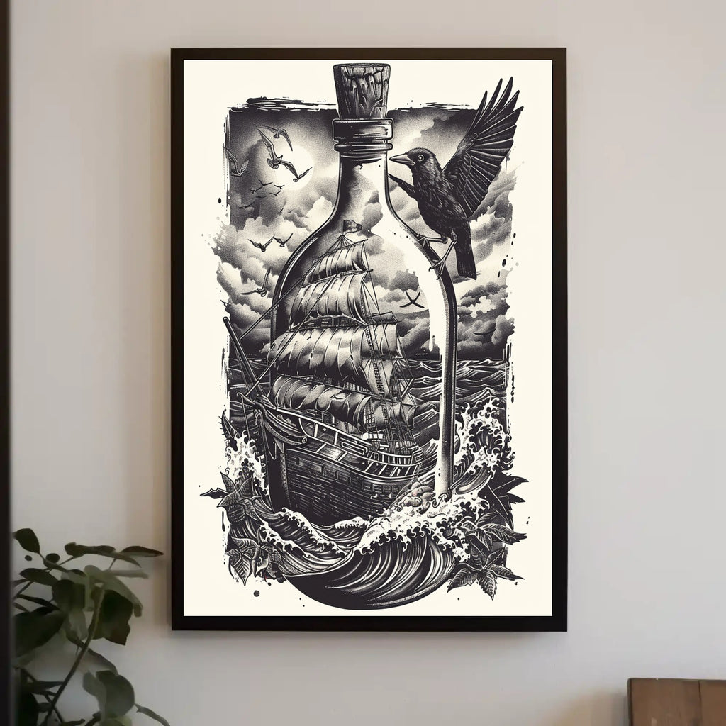 Ship In A Bottle Poster Art Print for Home Decor — a striking monochrome illustration that turns any wall into a scene of maritime mystery. This PosterGoat original captures a full-rigged ship cradled inside a classic glass bottle, framed by dramatic waves, rolling clouds, flying gulls and a watchful crow perched on the bottle's neck.