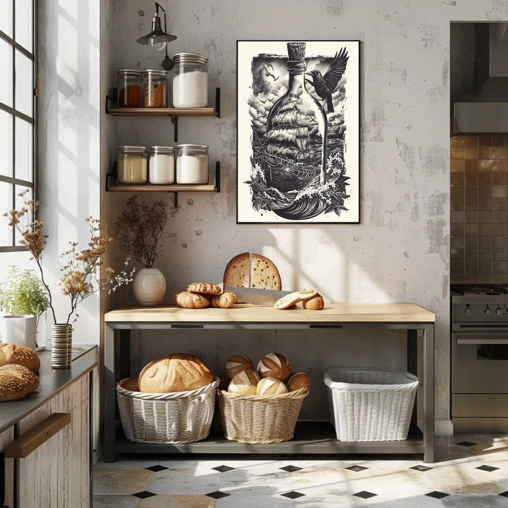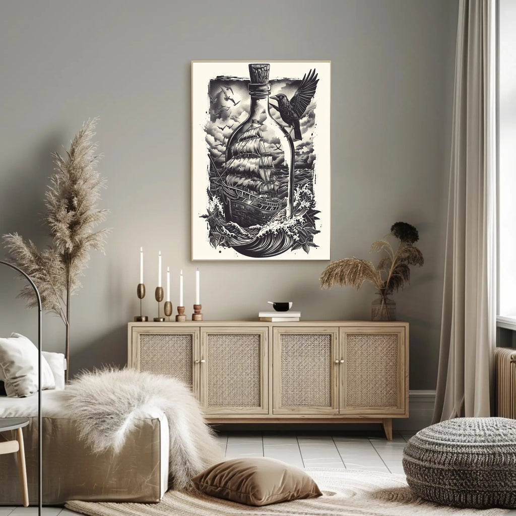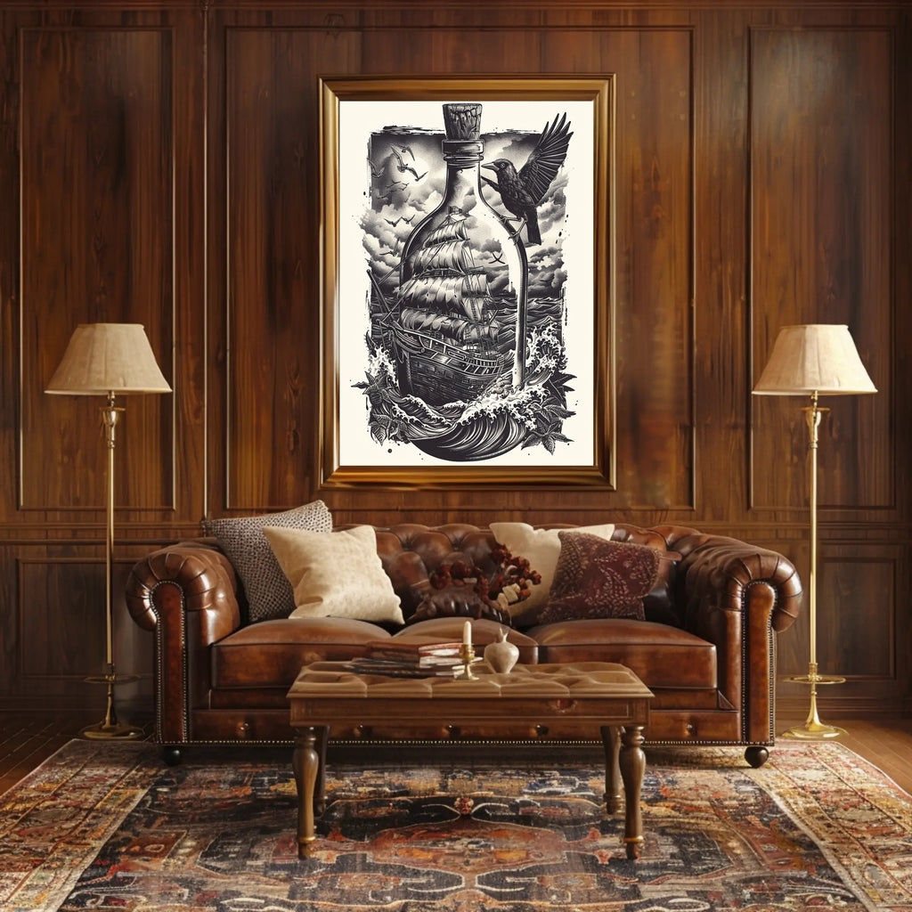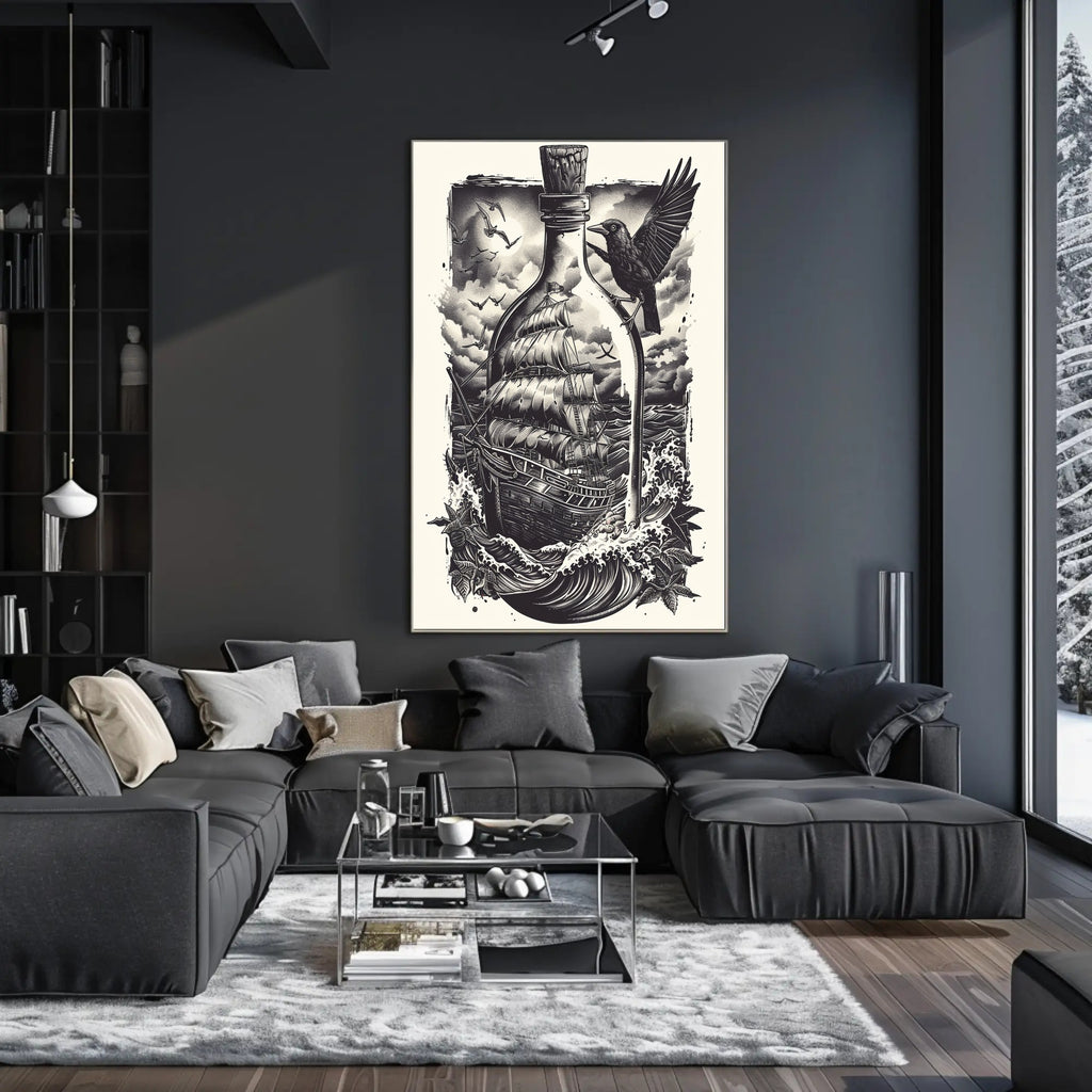 Ship In A Bottle Poster Art Print for Home Decor — a striking monochrome illustration that turns any wall into a scene of maritime mystery. This PosterGoat original captures a full-rigged ship cradled inside a classic glass bottle, framed by dramatic waves, rolling clouds, flying gulls and a watchful crow perched on the bottle's neck.