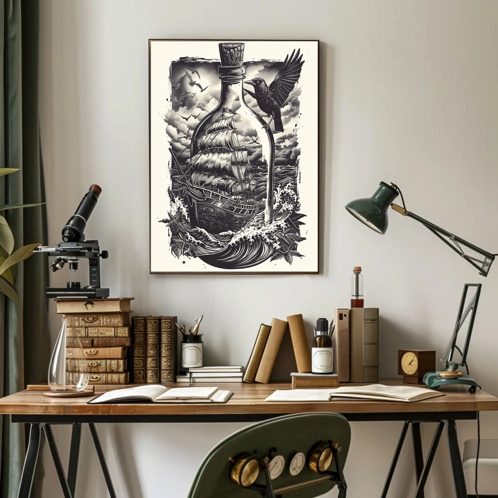 Bring adventure and character to your walls with this Ship in a Bottle poster — an evocative piece that sparks conversation and complements a range of interiors. Add it to your cart now to elevate your home wall decor with PosterGoat quality.