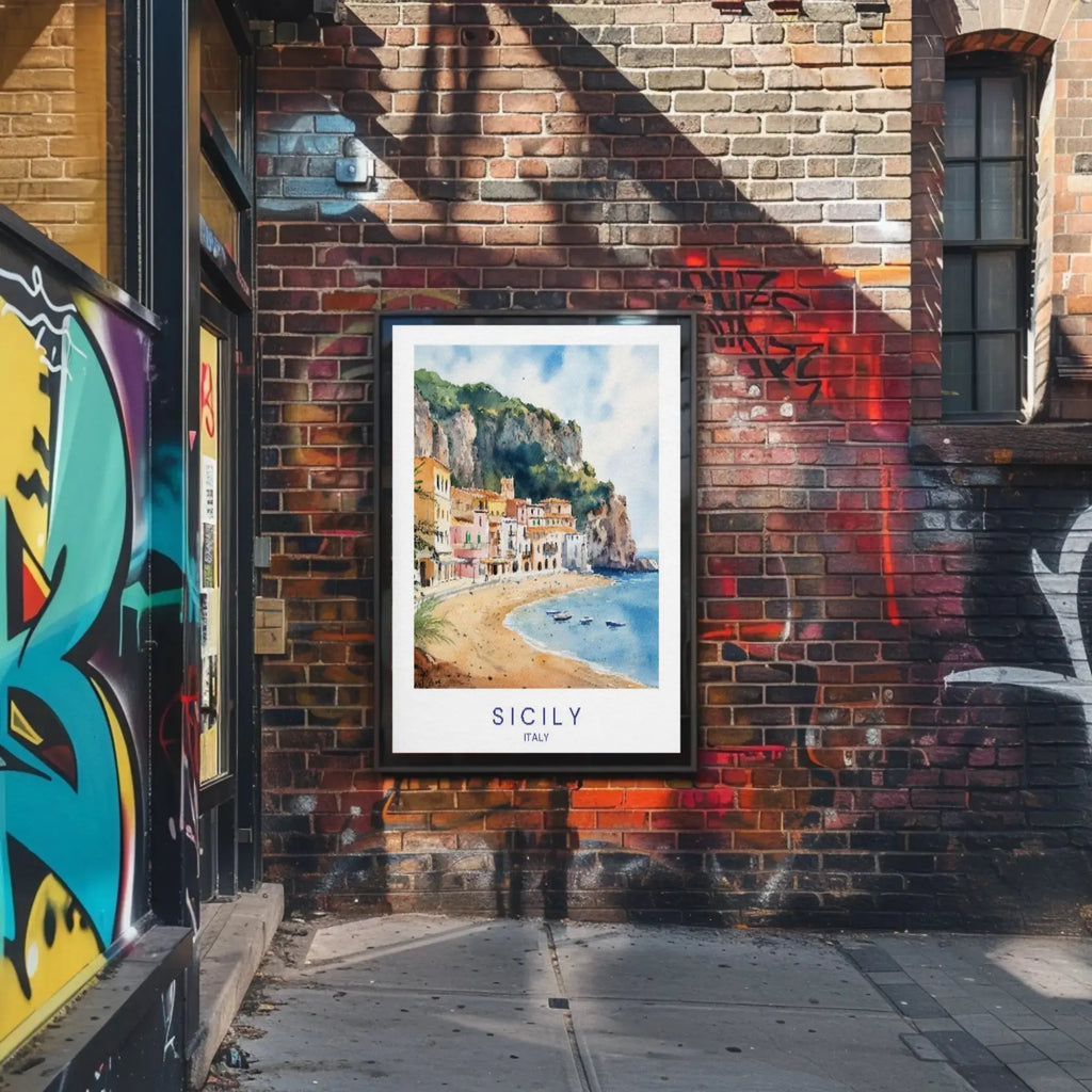 This enchanting poster beautifully captures the idyllic charm of a Sicilian seaside village in a captivating watercolor style. The soft, blended colors and fluid brushstrokes highlight the village's picturesque architecture, nestled along a serene coastline. The earthy tones of the buildings are complemented by the deep blue of the sea and lush green of the vegetation, evoking a warm and inviting Mediterranean ambiance. Ideal for those who dream of a tranquil getaway in Southern Italy, this poster brings the essence of a peaceful vacation spot into your space, inspiring relaxation and wanderlust.