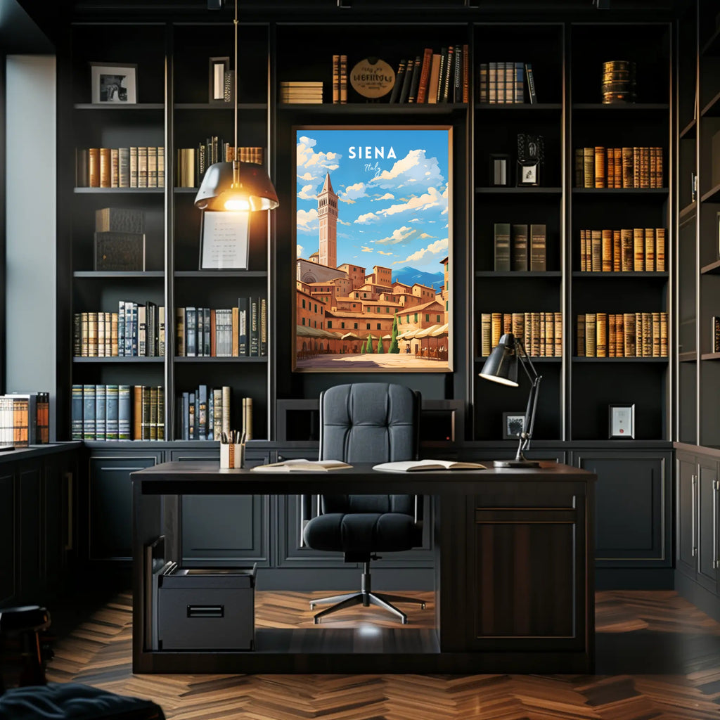 Striking illustrative design: Classical, hand-rendered style that highlights Siena’s medieval architecture and warm Tuscan palette—ideal for living rooms, offices, or travel-themed spaces.